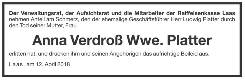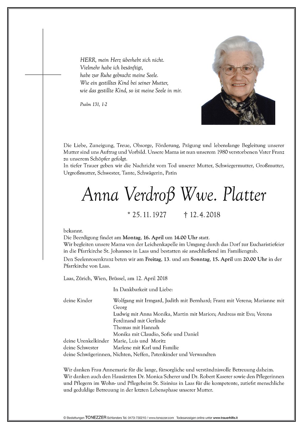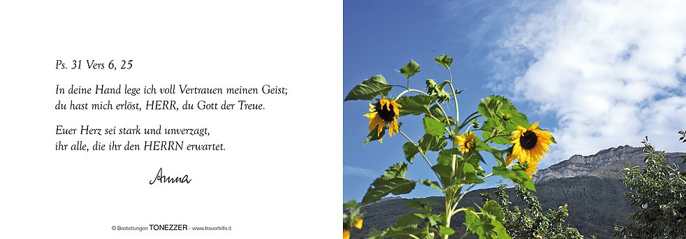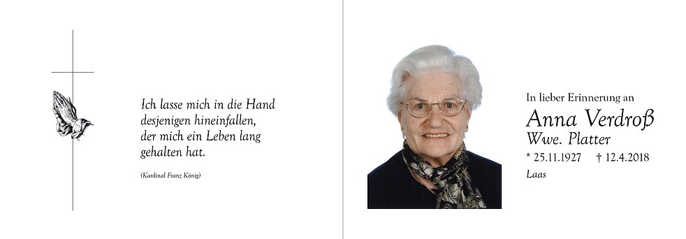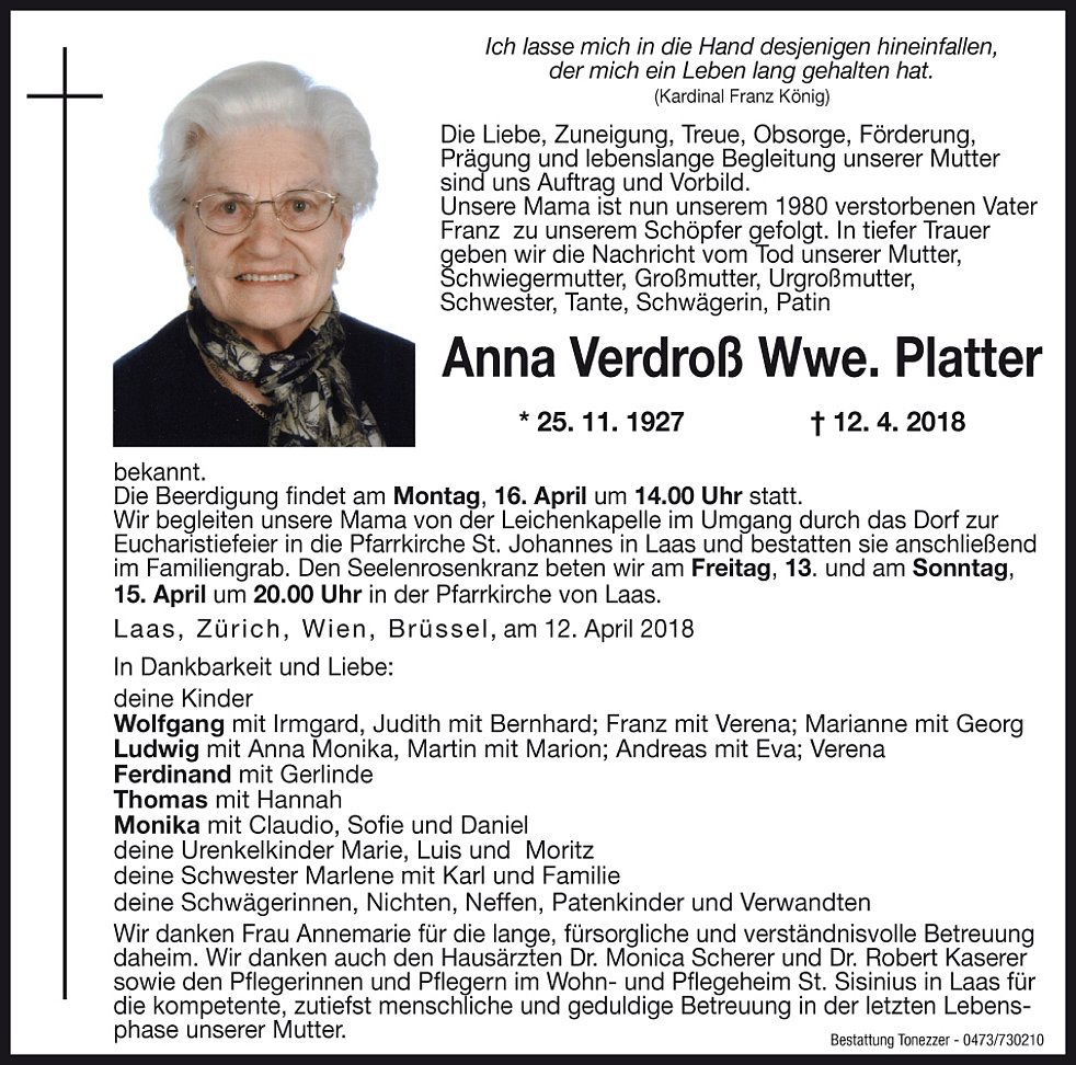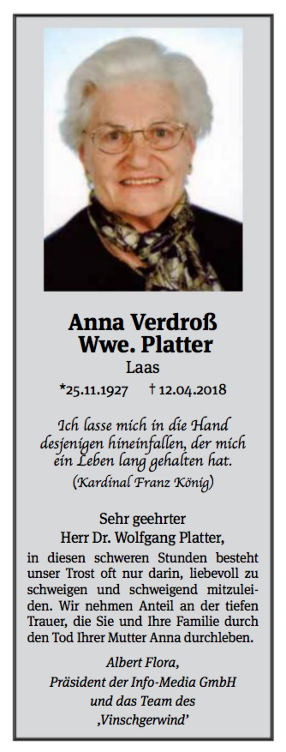 Wir danken auch den Hausärzten Dr. Monica Scherer und Dr. Robert Kaserer sowie den Pflegerinnen und Pflegern im Wohn- und Pflegeheim St. Sisinius in Laas für die kompetente, zutiefst menschliche und geduldige Betreuung in der letzten Lebensphase unserer Mutter.