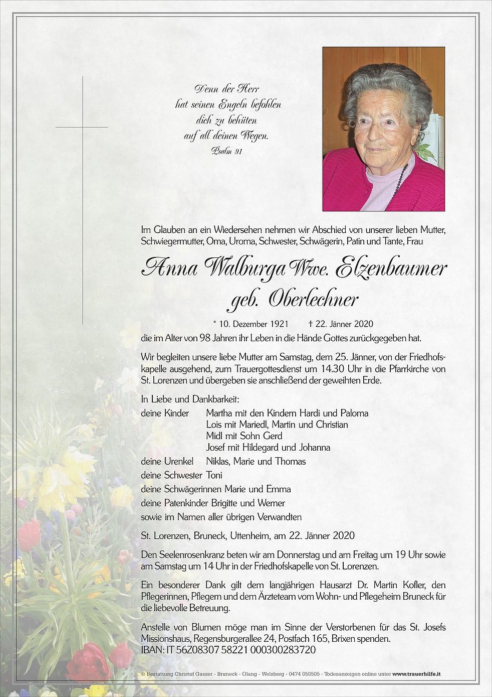 Anstelle von Blumen möge man im Sinne der Verstorbenen für das St. Josefs Missionshaus, Regensburgerallee 24, Postfach 165, Brixen spenden.