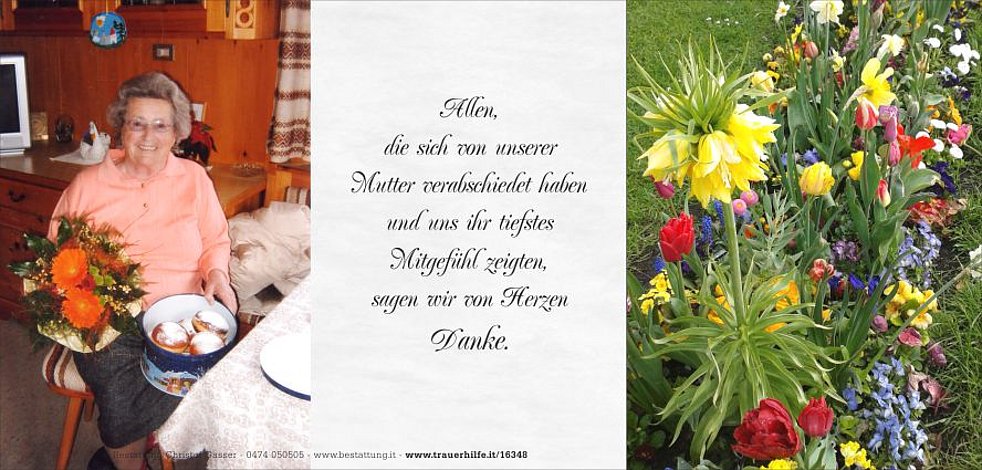 Ein besonderer Dank gilt dem langjährigen Hausarzt Dr. Martin Kofler, den Pflegerinnen, Pflegern und dem Ärzteteam vom Wohn- und Pflegeheim Bruneck für die liebevolle Betreuung.