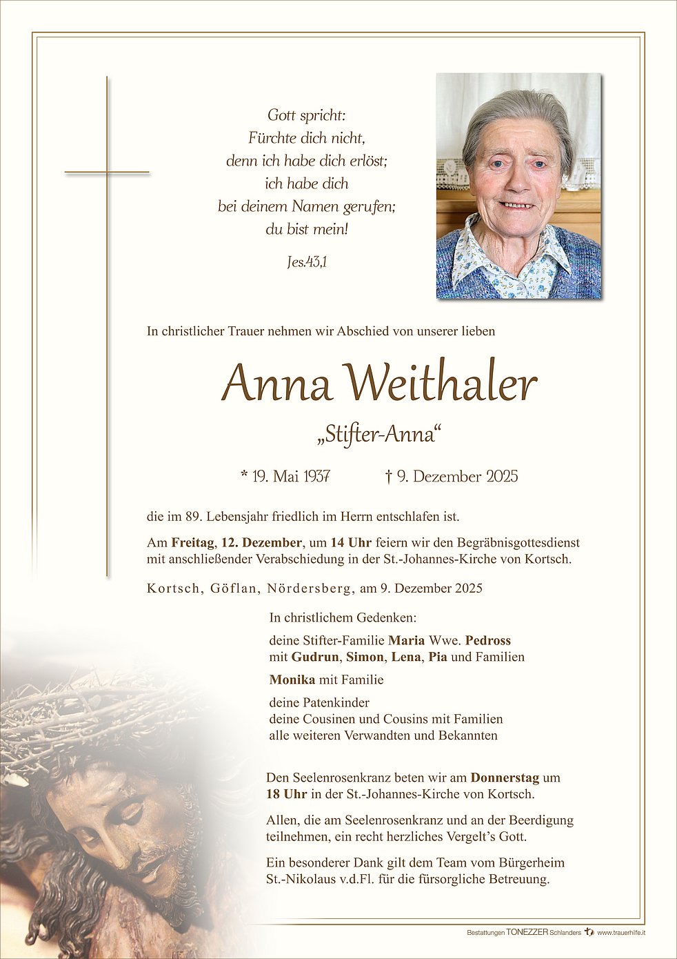 Am Freitag, 12. Dezember, um 14 Uhr feiern wir den Begräbnisgottesdienst mit anschließender Verabschiedung in der St.-Johannes-Kirche von Kortsch.