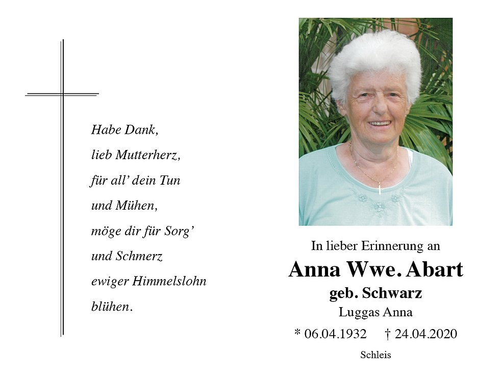 unserer guten Mama, Schwiegermama, Oma, Uroma, Schwester,