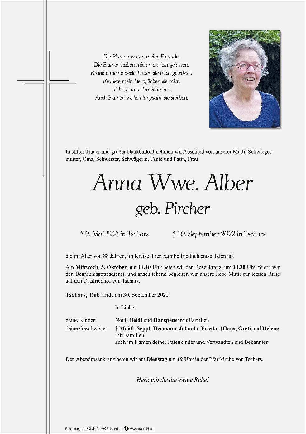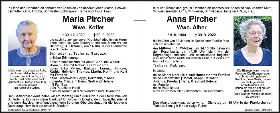 Am Mittwoch, 5. Oktober, um 14.10 Uhr beten wir den Rosenkranz; um 14.30 Uhr feiern wir den Begräbnisgottesdienst, und anschließend begleiten wir unsere liebe Mutti zur letzten Ruhe auf den Ortsfriedhof von Tschars.