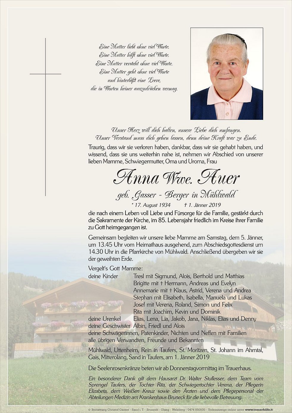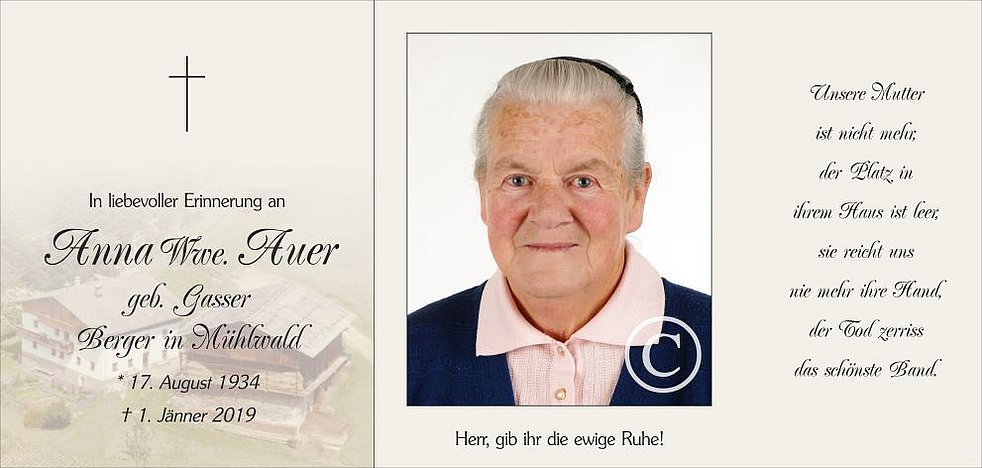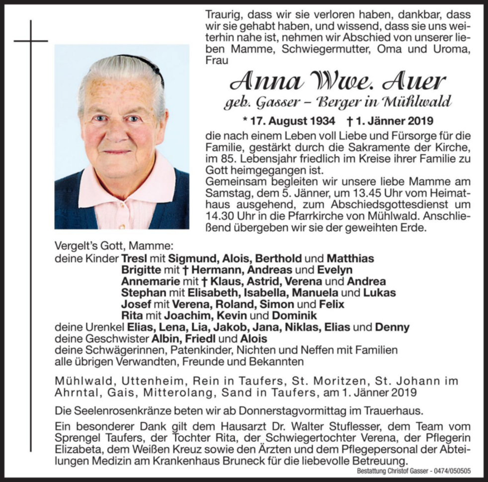 Gemeinsam begleiten wir unsere liebe Mamme am Samstag, dem 5. Jänner, um 13.45 Uhr vom Heimathaus ausgehend, zum Abschiedsgottesdienst um 14.30 Uhr in die Pfarrkirche von Mühlwald. Anschließend übergeben wir sie der geweihten Erde.