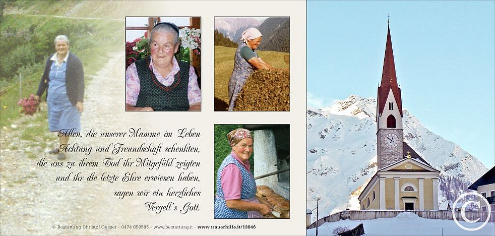 Ein besonderer Dank gilt dem Hausarzt Dr. Walter Stuflesser, dem Team vom Sprengel Taufers, der Tochter Rita, der Schwiegertochter Verena, der Pflegerin Elizabeta, dem Weißen Kreuz sowie den Ärzten und dem Pflegepersonal der Abteilungen Medizin am Krankenhaus Bruneck für die liebevolle Betreuung.