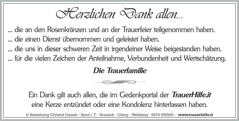 Wir bedanken uns beim Hausarzt Herrn Dr. Paul Gufler, dem Team vom Sanitäts- und Sozialsprengel sowie bei den Ärzten und dem Pflegepersonal der Abteilung Medizin A am Krankenhaus Bruneck.