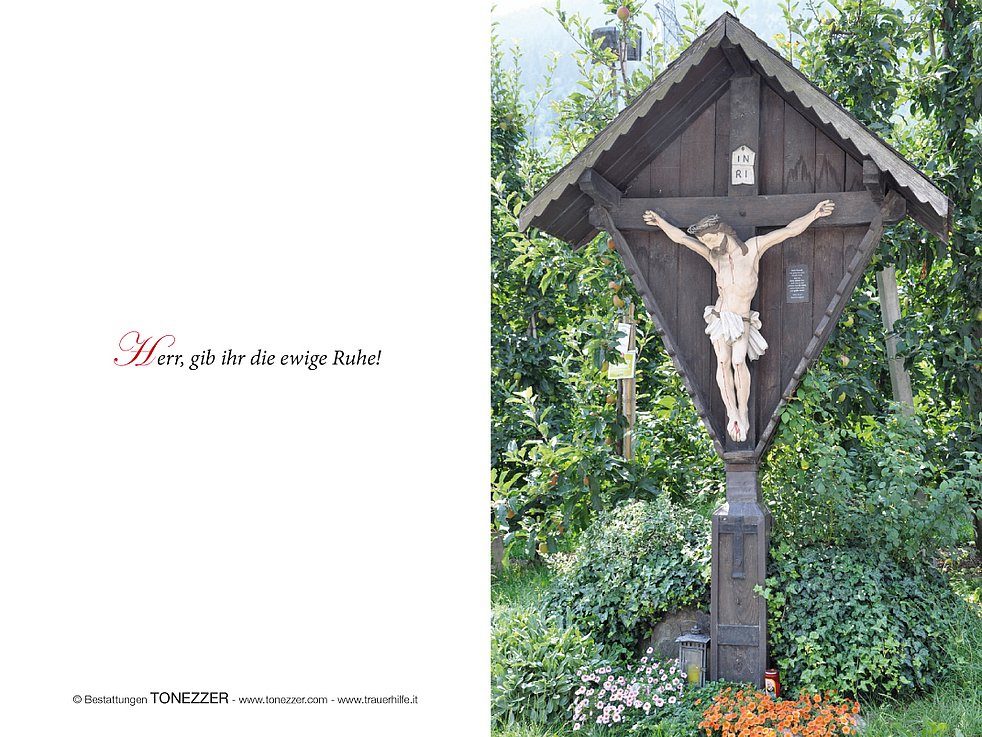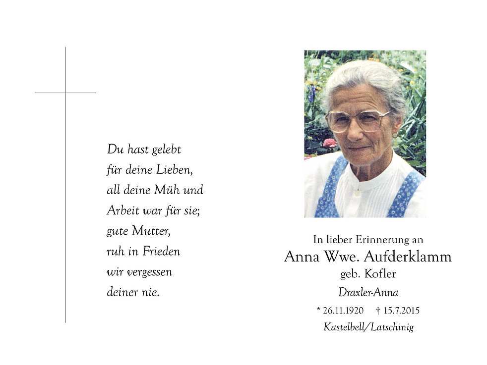 Wir begleiten unsere liebe Mutter am Samstag, 18. Juli, um 14.30 Uhr vom Kirchplatz aus zum Begräbnisgottesdienst in die Pfarrkirche und anschließend zur letzten Ruhe auf den Ortsfriedhof von Kastelbell/Marein.