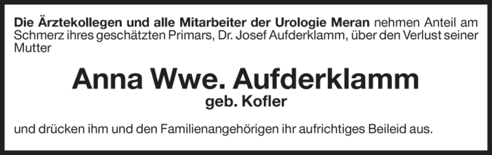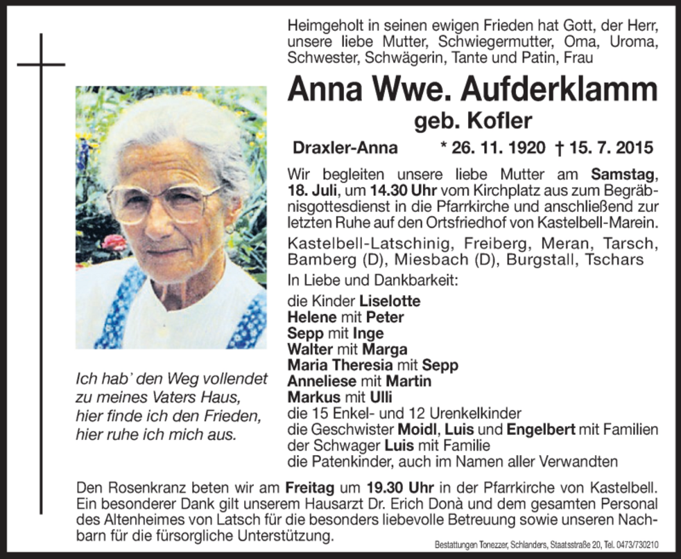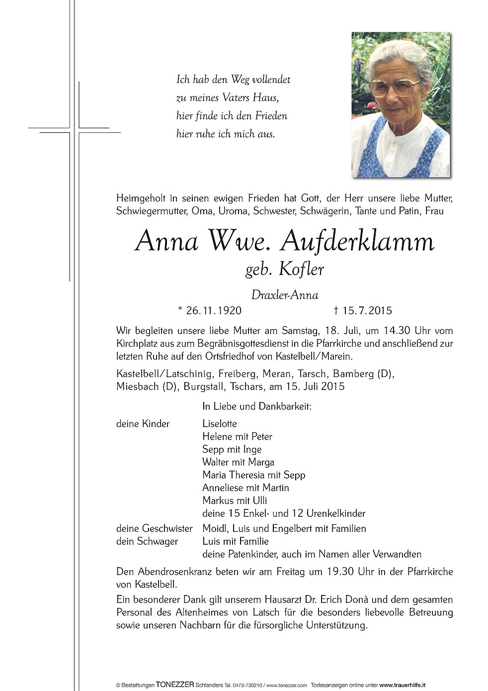 Ein besonderer Dank gilt unserem Hausarzt Dr. Erich Donà und dem gesamten Personal des Altenheimes von Latsch für die besonders liebevolle Betreuung sowie unseren Nachbarn für die fürsorgliche Unterstützung.