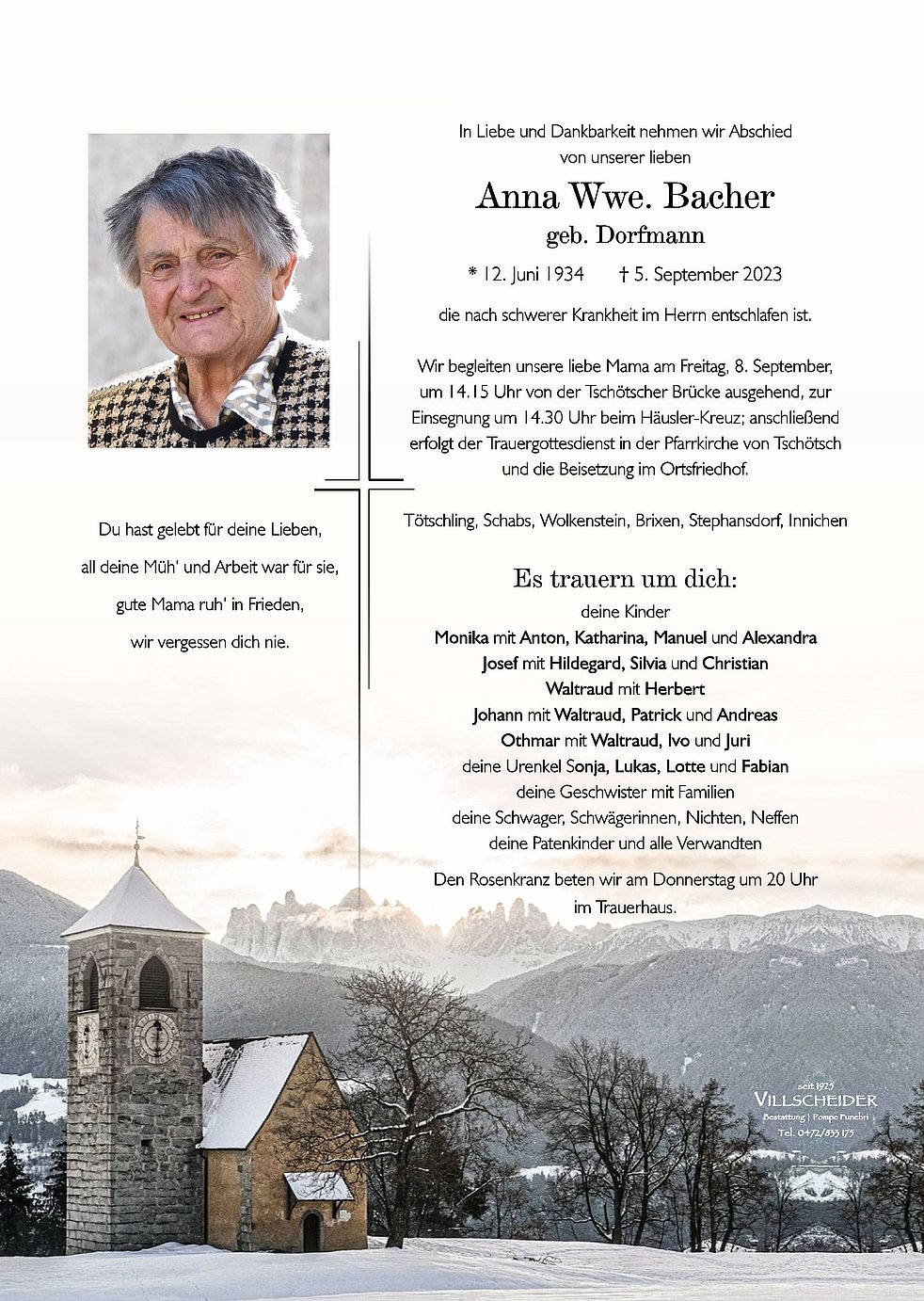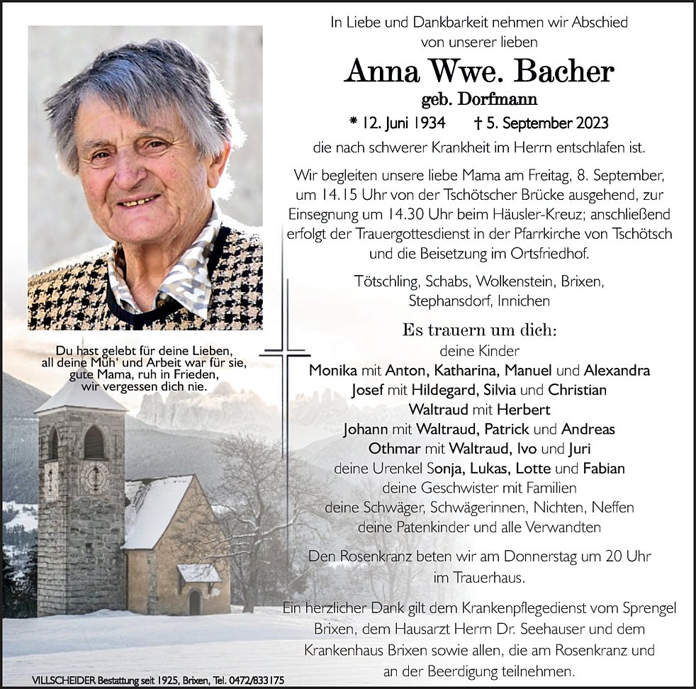 Begräbnisgottesdienst: 08.09. - 14:30 Uhr Häusler-Kreuz in Tschötsch