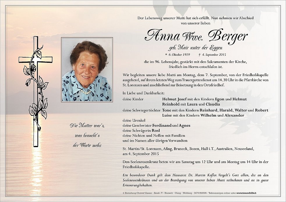 Ein besonderer Dank gilt dem Hausarzt Dr. Martin Kofler. Vergelt’s Gott allen, die an den Seelenrosenkränzen und an der Beerdigung von unserer lieben Mutti teilnehmen und sie in guter Erinnerung behalten.