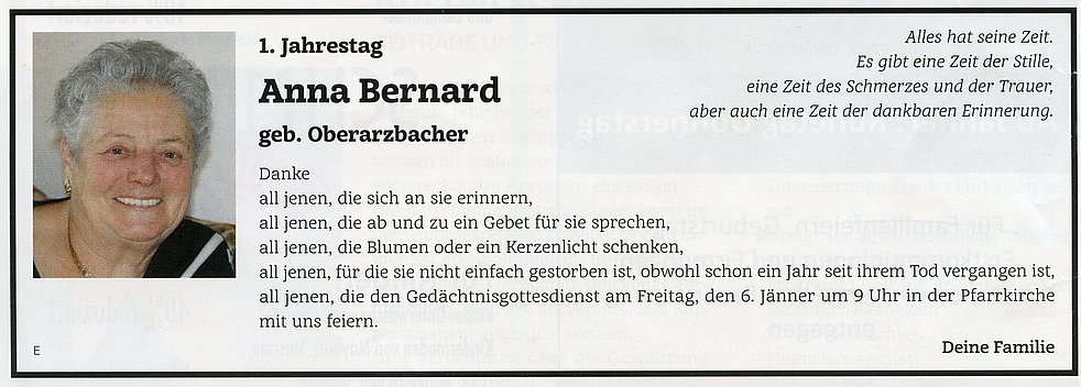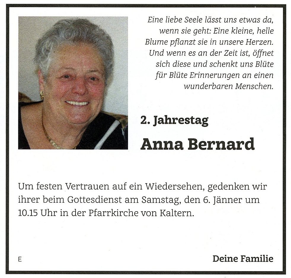 Den Trauergottesdienst feiern wir für dich am Dienstag, dem 12. Jänner um 14.30 Uhr in der Pfarrkirche von Kaltern. Anschließend begleiten wir dich auf den Ortsfriedhof. Den Seelenrosenkranz beten wir heute, Montag, um 19 Uhr in der Kirche in St. Nikolaus/Kaltern.