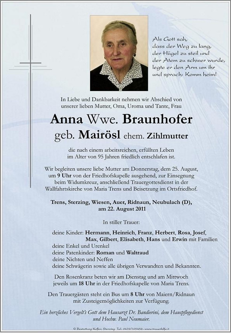 Wir begleiten unsere liebe Mutter am Donnerstag, dem 25. August, um 9 Uhr von der Friedhofskapelle ausgehend, zur Einsegnung beim Widumkreuz, anschließend Trauergottesdienst in der Wallfahrtskirche von Maria Trens und Beisetzung im Ortsfriedhof.