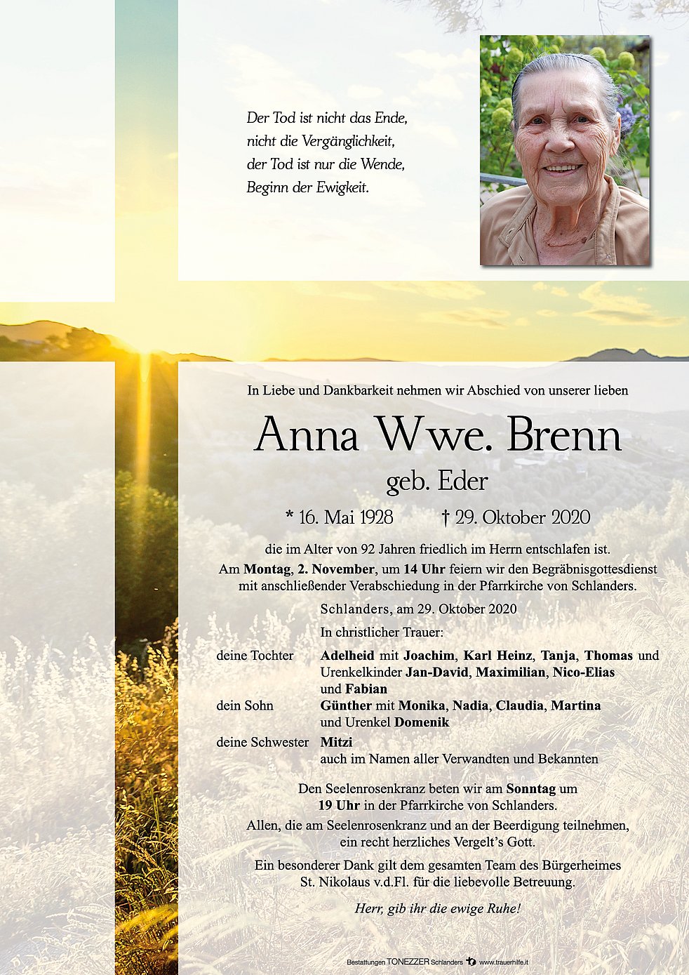 Am Montag, 2. November, um 14 Uhr feiern wir den Begräbnisgottesdienst mit anschließender Verabschiedung in der Pfarrkirche von Schlanders.