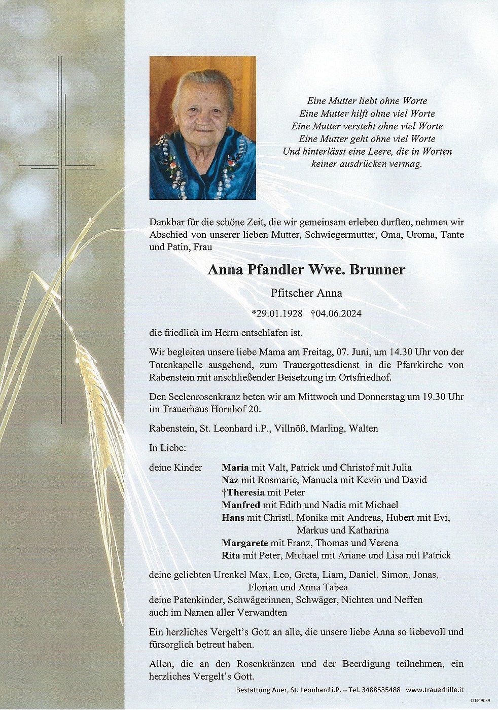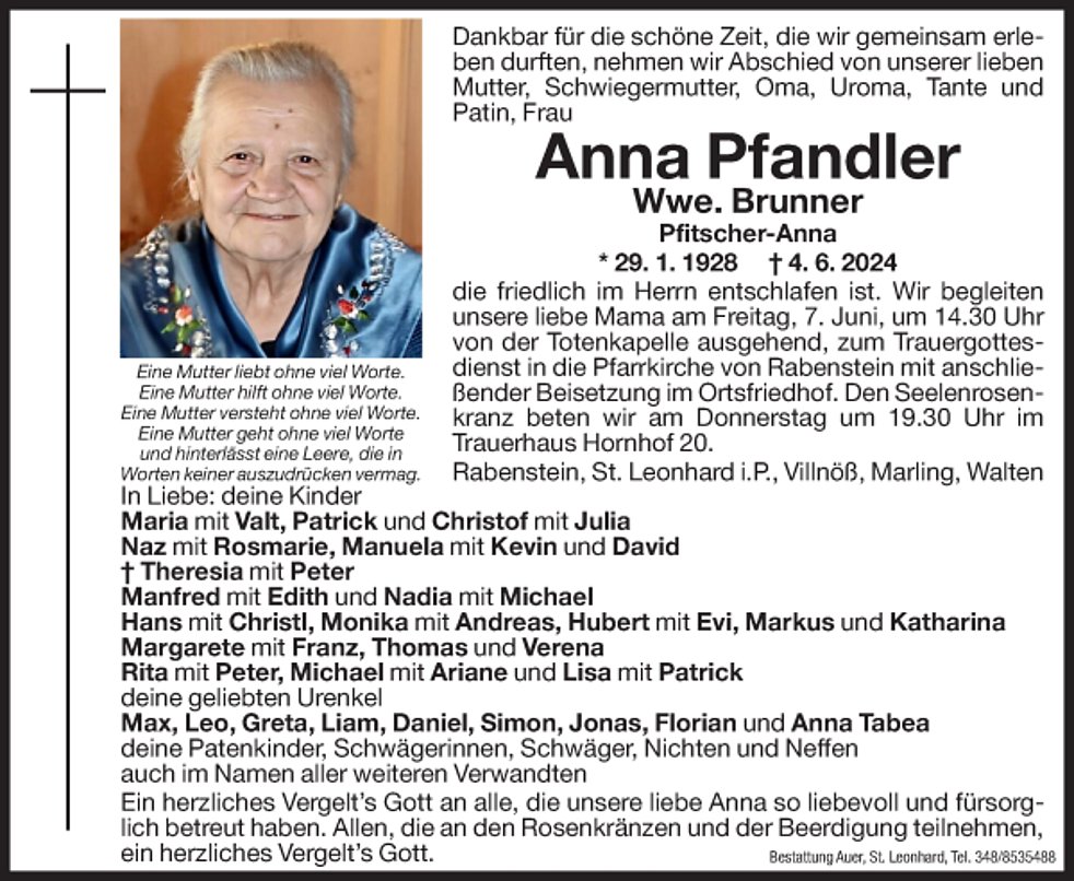 Wir begleiten unsere liebe Mama am Freitag, 07. Juni, um 14.30 Uhr von der Totenkapelle ausgehend, zum Trauergottesdienst in die Pfarrkirche von Rabenstein mit anschließender Beisetzung im Ortsfriedhof.