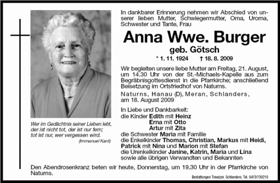 Wir begleiten unsere liebe Mutter am Freitag, 21. August, um 14.30 Uhr von der St. Michaelskapelle aus zum Begräbnisgottesdienst in die Pfarrkirche; anschließend Beisetzung im Ortsfriedhof von Naturns.