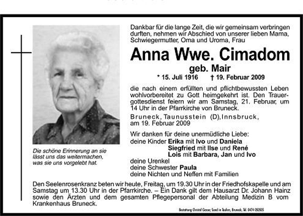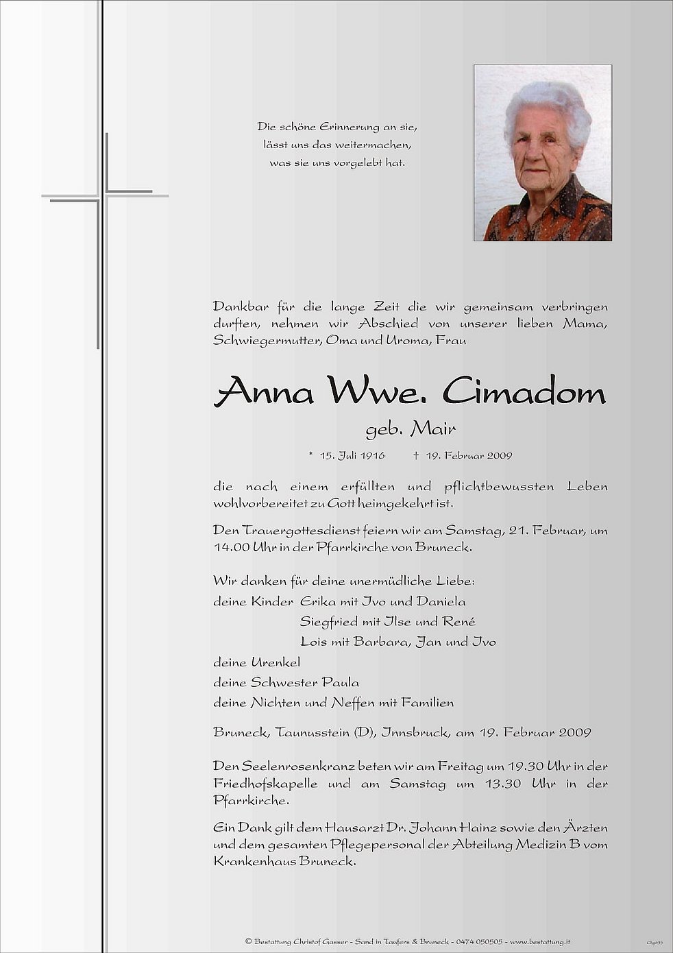 Dankbar für die lange Zeit die wir gemeinsam verbringen durften nehmen wir Abschied von unserer lieben Mama, Schwiegermutter, Oma und Uroma, Frau