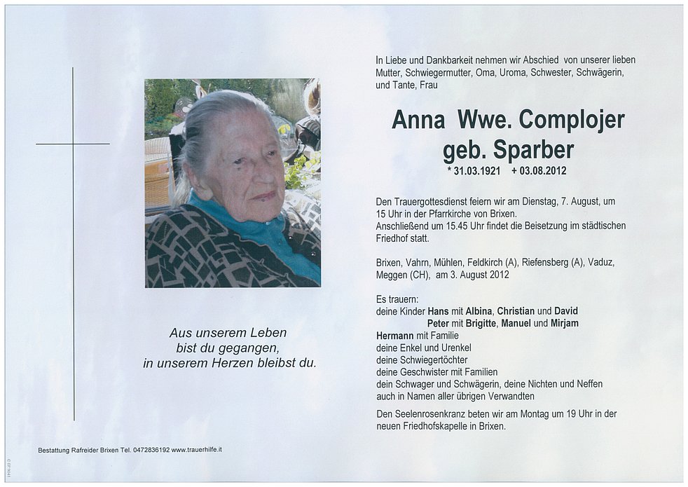 Gedankt sei dem Pflegepersonal des Bezirksaltenheimes von Sterzing für die liebevolle Betreuung und allen, die am Rosenkranz und an der Beerdigung teilnehmen.