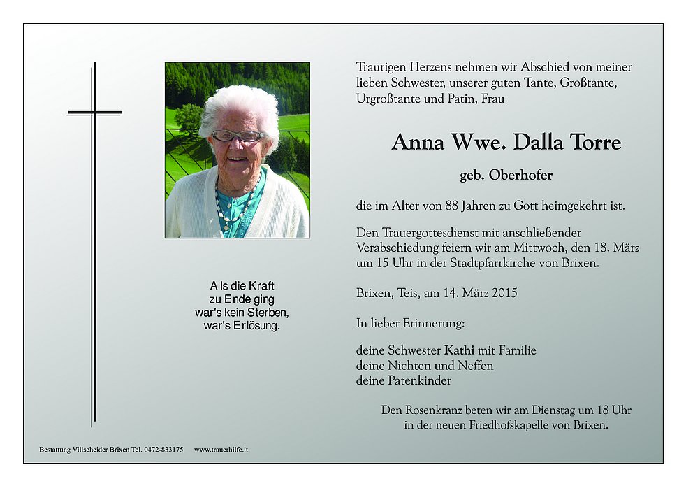 Den Trauergottesdienst mit anschließender Verabschiedung feiern wir am Mittwoch, den 18. März um 15 Uhr in der Stadtpfarrkirche von Brixen.