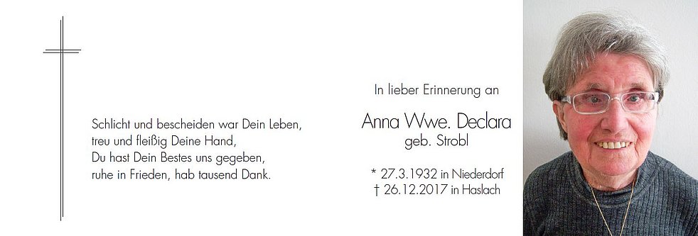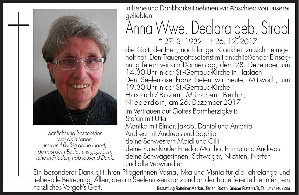 Den Trauergottesdienst mit anschließender Einsegnung feiern wir am Donnerstag, dem 28. Dezember, um 14.30 Uhr in der St. Gertraud Kirche in Haslach.