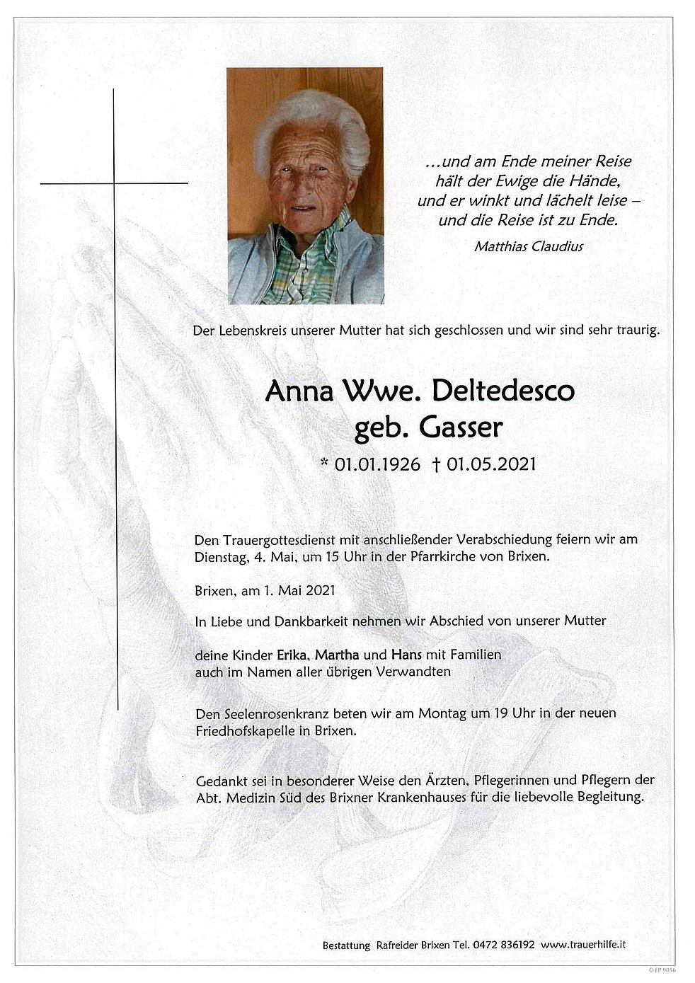 Den Trauergottesdienst mit anschließender Verabschiedung feiern wir am Dienstag, 4. Mai, um 15 Uhr in der Pfarrkirche von Brixen.