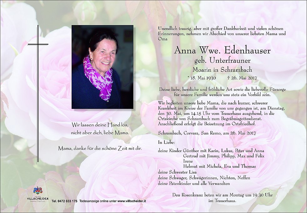 Wir begleiten unsere liebe Mama, die nach kurzer, schwerer Krankheit im Kreise der Familie von uns gegangen ist, am Dienstag, den 30. Mai, um 14.15 Uhr vom Trauerhaus ausgehend, in die Ortskirche von Schrambach zum Begräbnisgottesdienst. Anschließend erfolgt die Beisetzung im Ortsfriedhof.