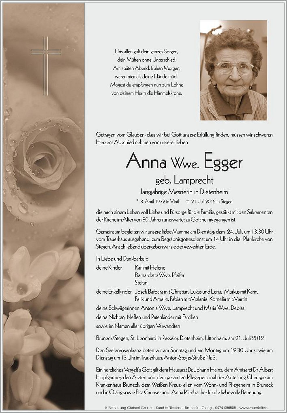 Gemeinsam begleiten wir unsere liebe Mamma am Dienstag, dem 24. Juli, um 13.30 Uhr vom Trauerhaus ausgehend, zum Begräbnisgottesdienst um 14 Uhr in die Pfarrkirche von Stegen. Anschließend übergeben wir sie der geweihten Erde.