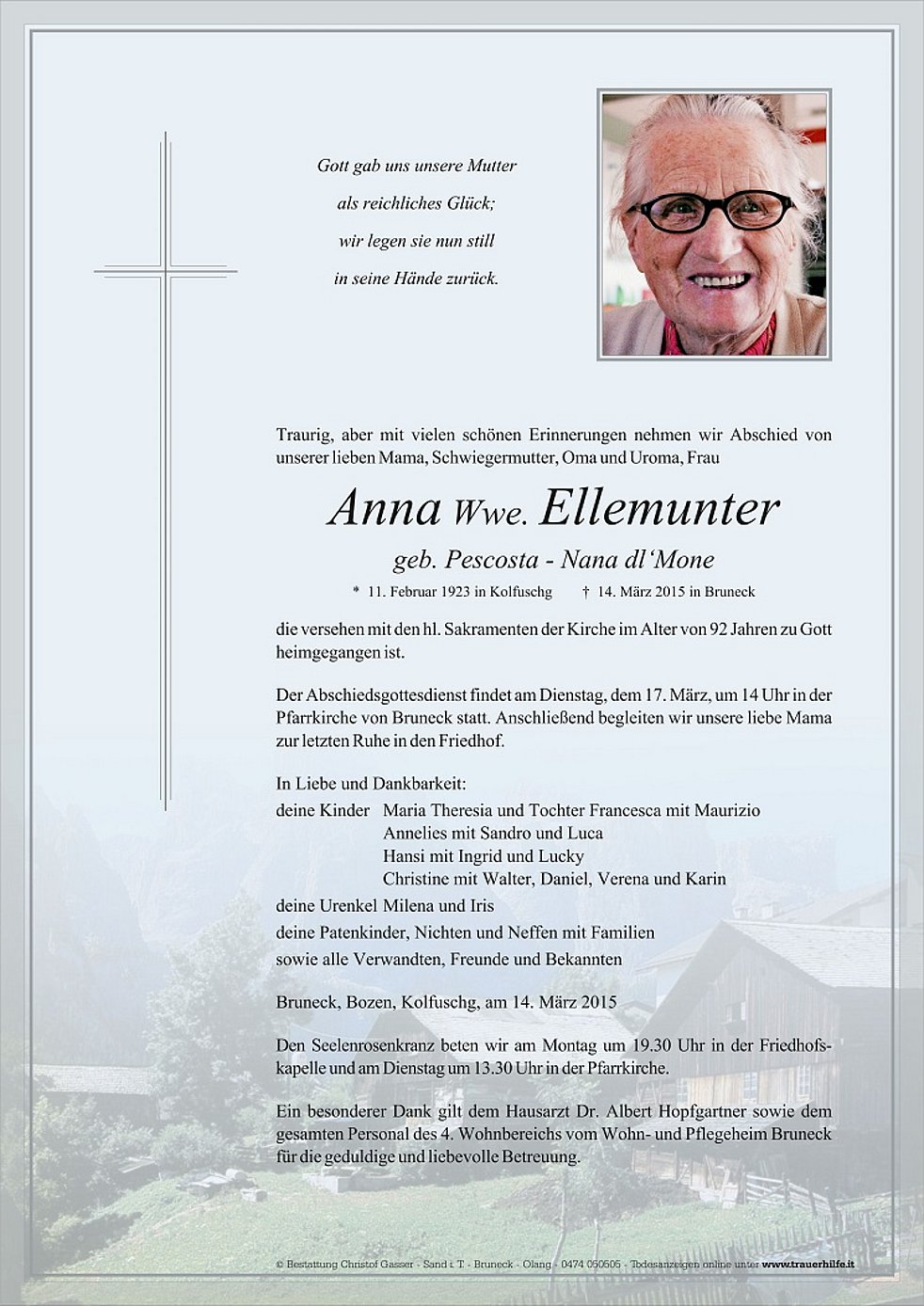 Der Abschiedsgottesdienst findet am Dienstag, dem 17. März, um 14 Uhr in der Pfarrkirche von Bruneck statt. Anschließend begleiten wir unsere liebe Mama zur letzten Ruhe in den Friedhof.