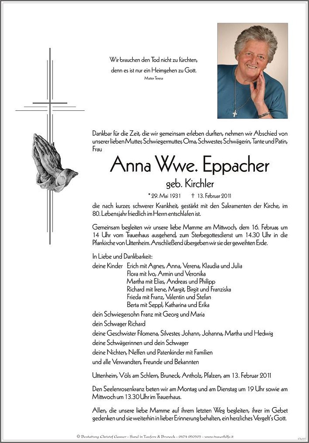 Allen, die unsere liebe Mamme auf ihrem letzten Weg begleiten, ihrer im Gebet gedenken und sie weiterhin in lieber Erinnerung behalten, ein herzliches Vergelt’s Gott.