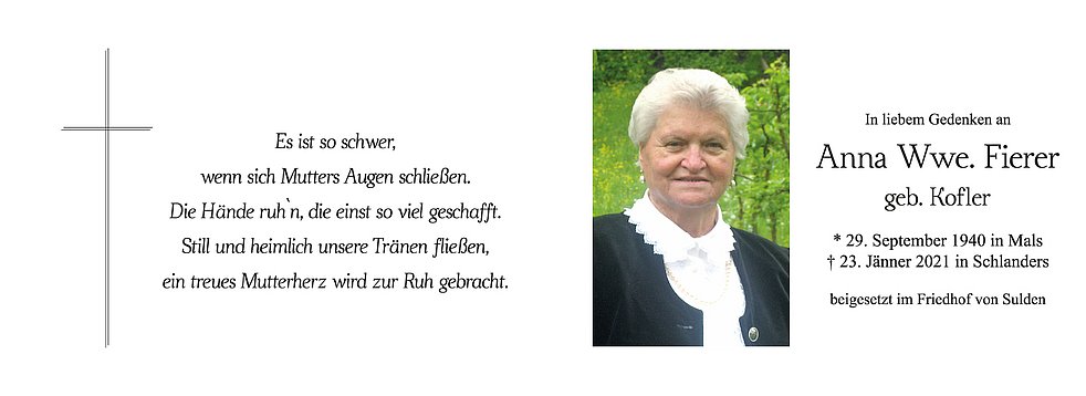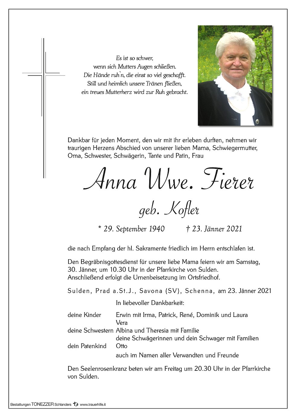 Den Begräbnisgottesdienst für unsere liebe Mama feiern wir am Samstag, 30. Jänner, um 10.30 Uhr in der Pfarrkirche von Sulden.