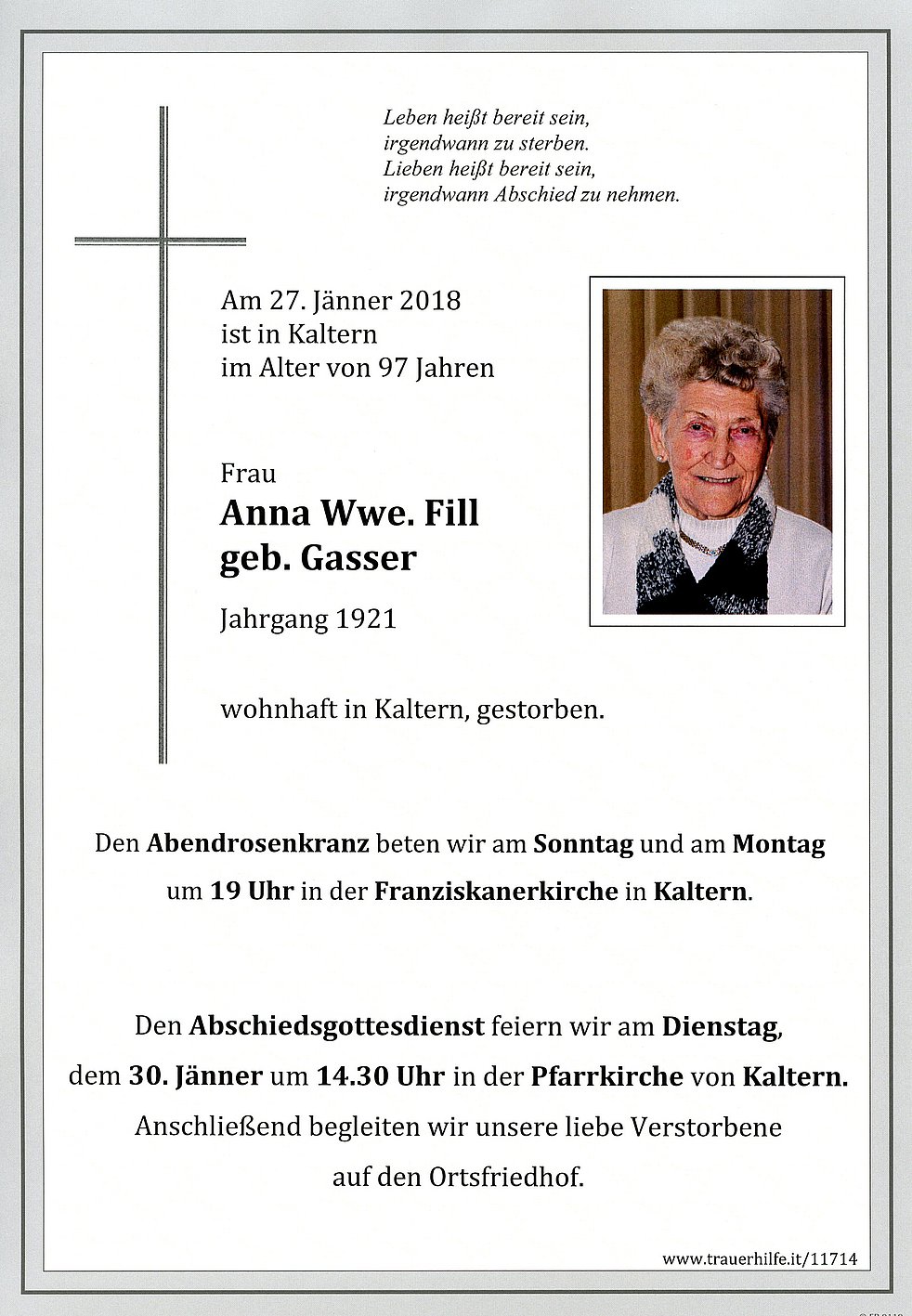 Den Abschiedsgottesdienst feiern wir am Dienstag, dem 30. Jänner um 14.30 Uhr in der Pfarrkirche von Kaltern. Anschließend begleiten wir unsere liebe Verstorbene auf den Ortsfriedhof.