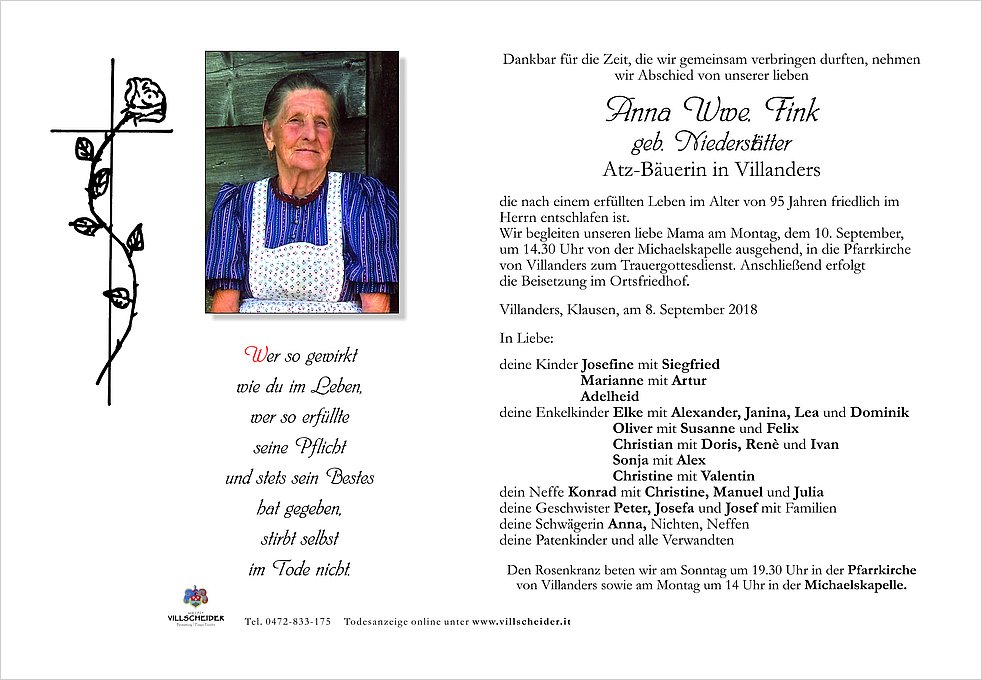 um 14.30 Uhr von der Michaelskapelle ausgehend, in die Pfarrkirche von Villanders zum Trauergottesdienst. Anschließend erfolgt