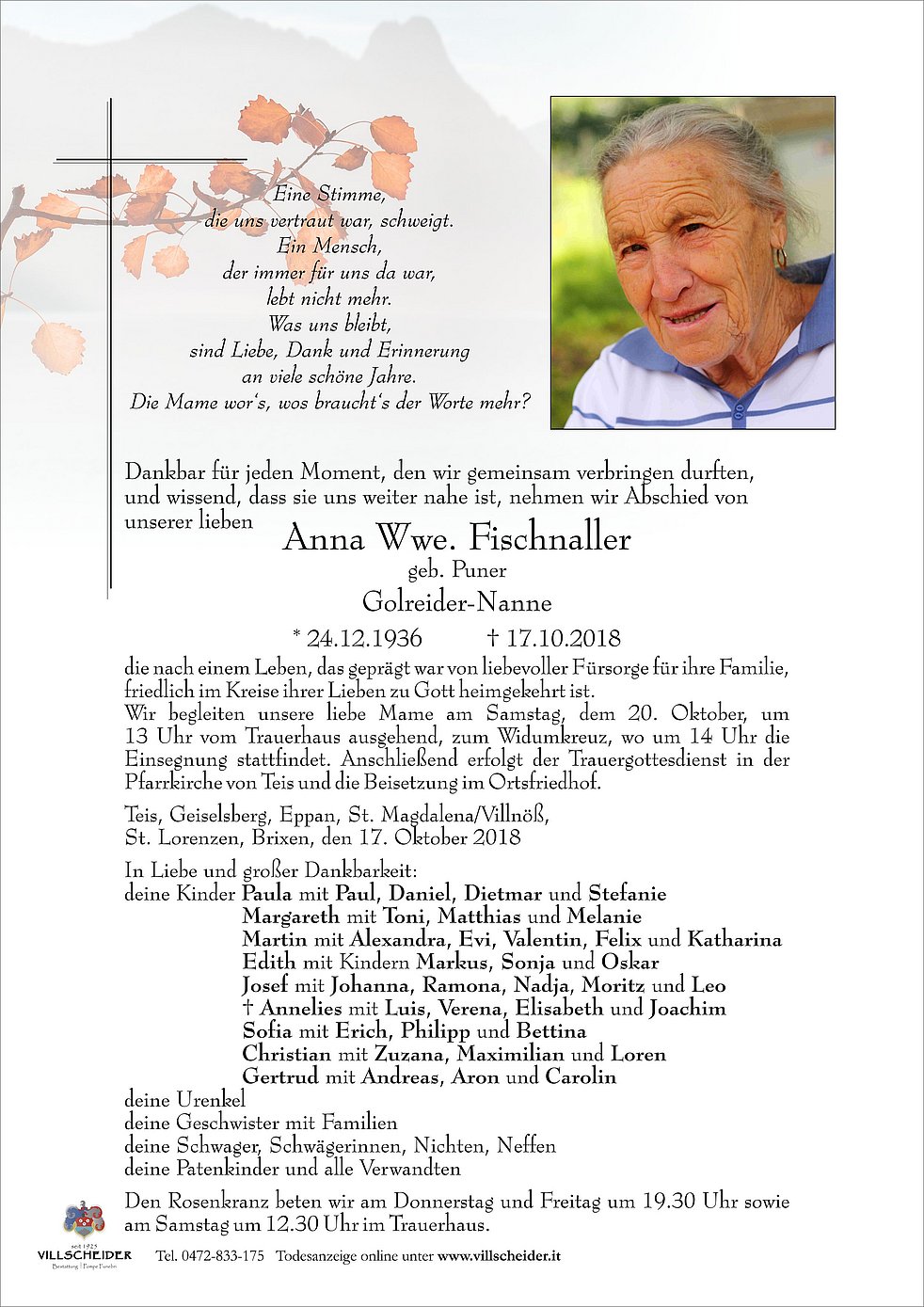 Begräbnisgottesdienst: 20.10. - 14:30 Uhr Teis