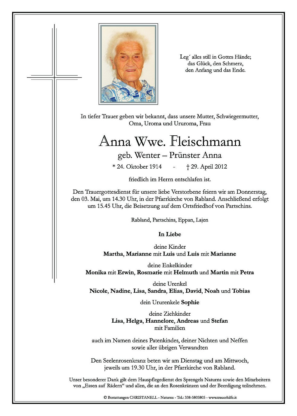Den Trauergottesdienst für unsere liebe Verstorbene feiern wir am Donnerstag, den 03. Mai, um 14.30 Uhr, in der Pfarrkirche von Rabland. Anschließend erfolgt um 16.00 Uhr, die Beisetzung auf dem Ortsfriedhof von Partschins.