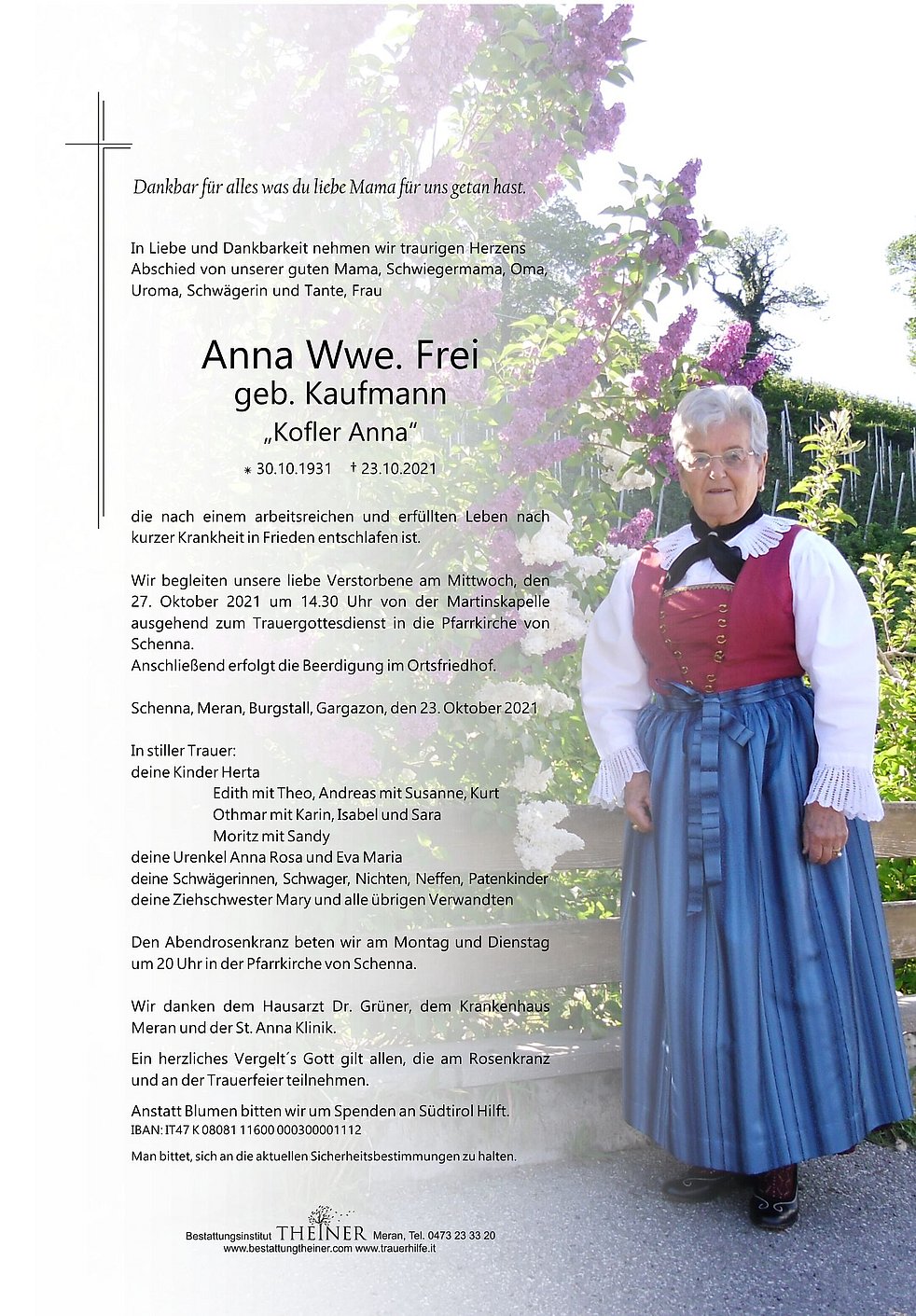 Wir begleiten unsere liebe Verstorbene am Mittwoch, den 27. Oktober 2021 um 14.30 Uhr von der Martinskapelle ausgehend zum Trauergottesdienst in die Pfarrkirche von Schenna.