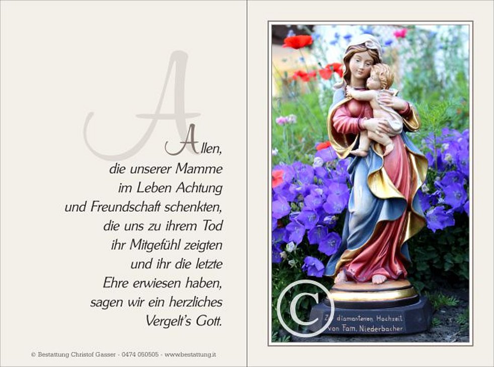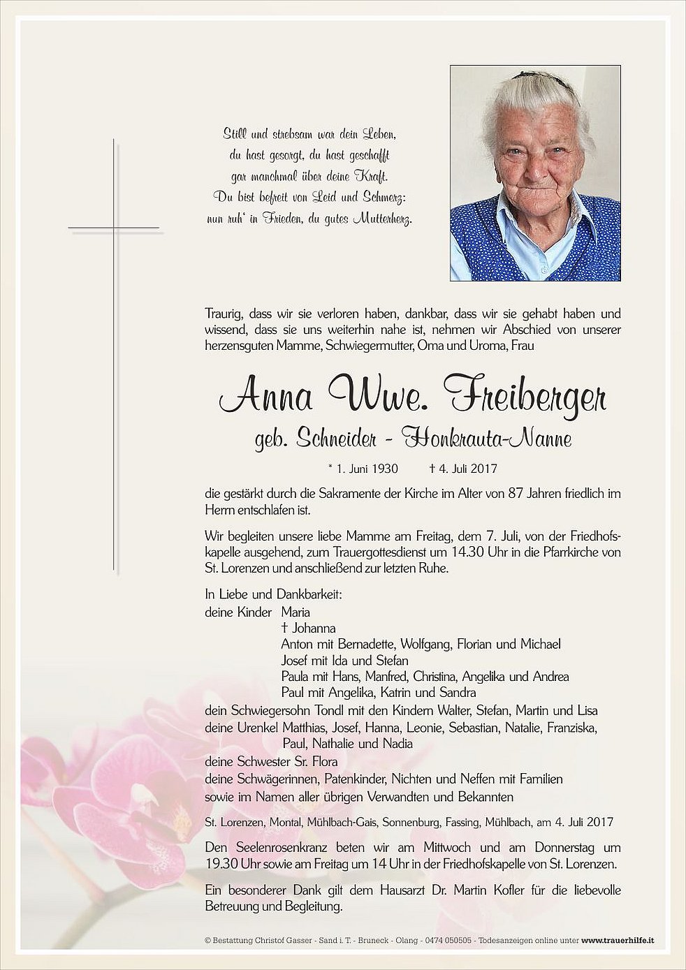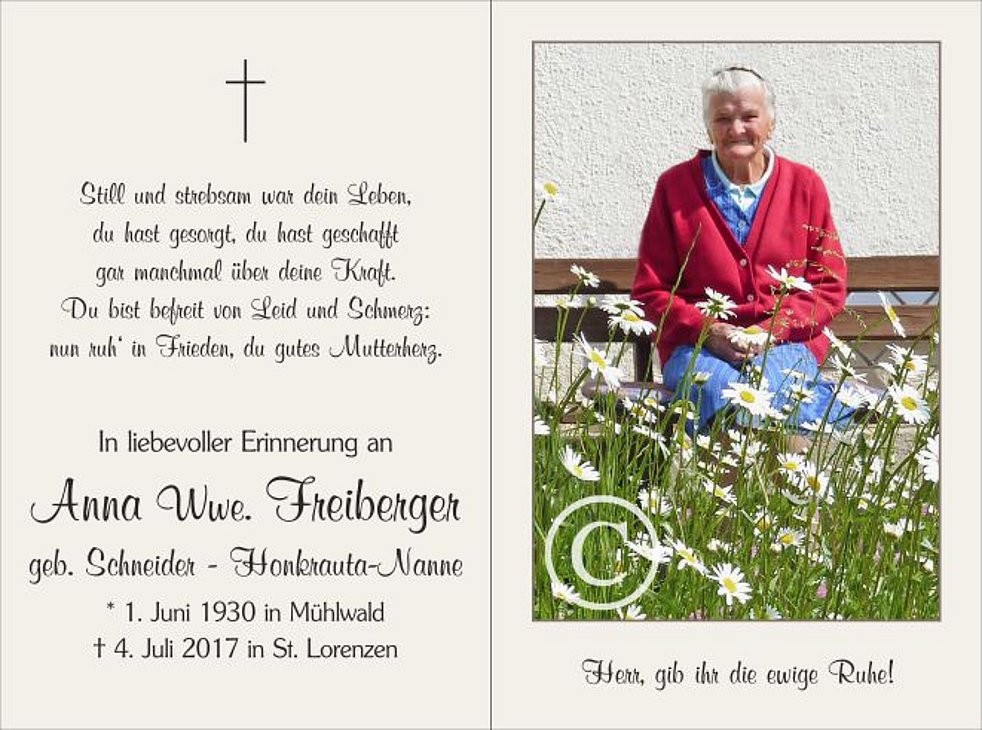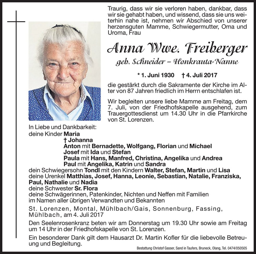 Wir begleiten unsere liebe Mamme am Freitag, dem 7. Juli, von der Friedhofskapelle ausgehend, zum Trauergottesdienst um 14.30 Uhr in die Pfarrkirche von St. Lorenzen und anschließend zur letzten Ruhe.