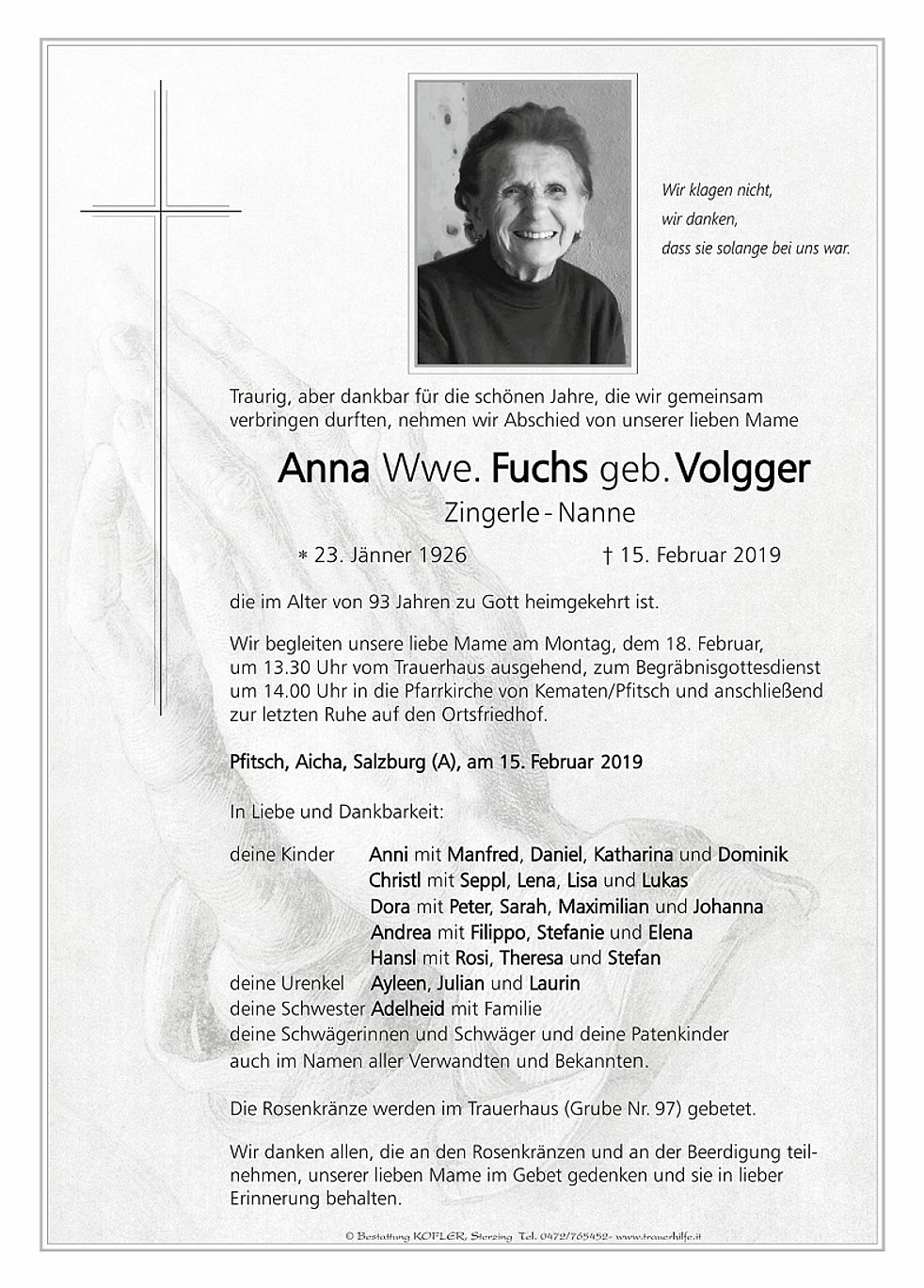 Wir begleiten unsere liebe Mame am Montag, dem 18. Februar, um 13.30 Uhr vom Trauerhaus ausgehend, zum Begräbnisgottesdienst um 14.00 Uhr in die Pfarrkirche von Kematen/Pfitsch und anschließend zur letzten Ruhe auf den Ortsfriedhof.