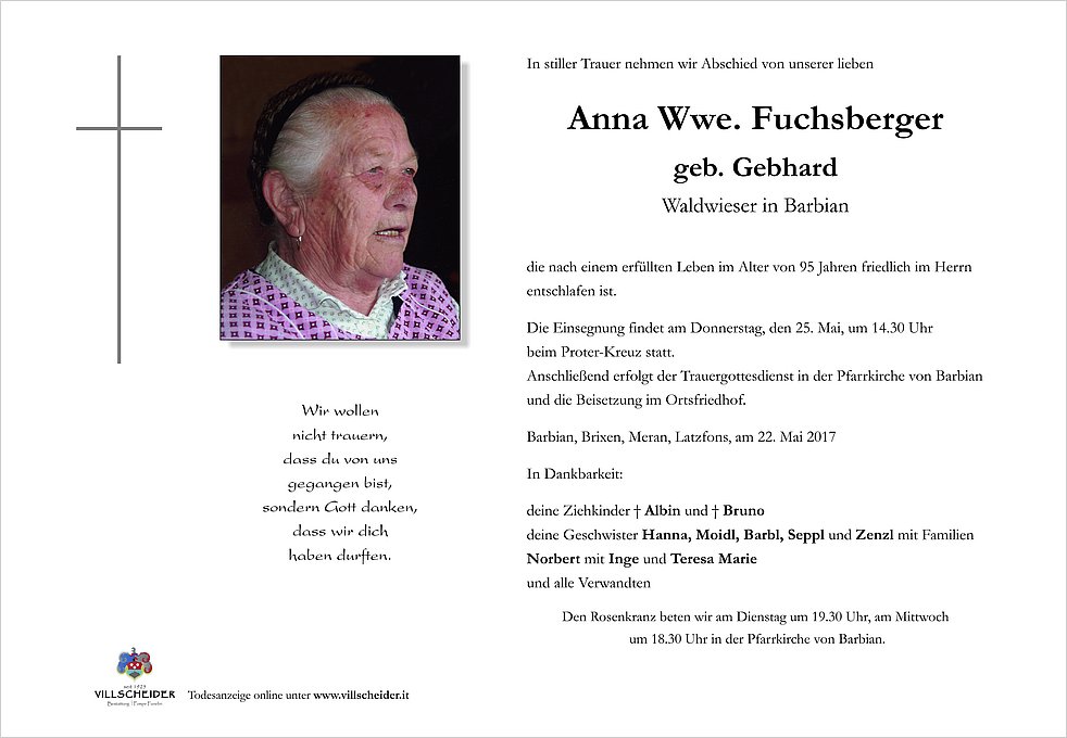Anschließend erfolgt der Trauergottesdienst in der Pfarrkirche von Barbian und die Beisetzung im Ortsfriedhof.