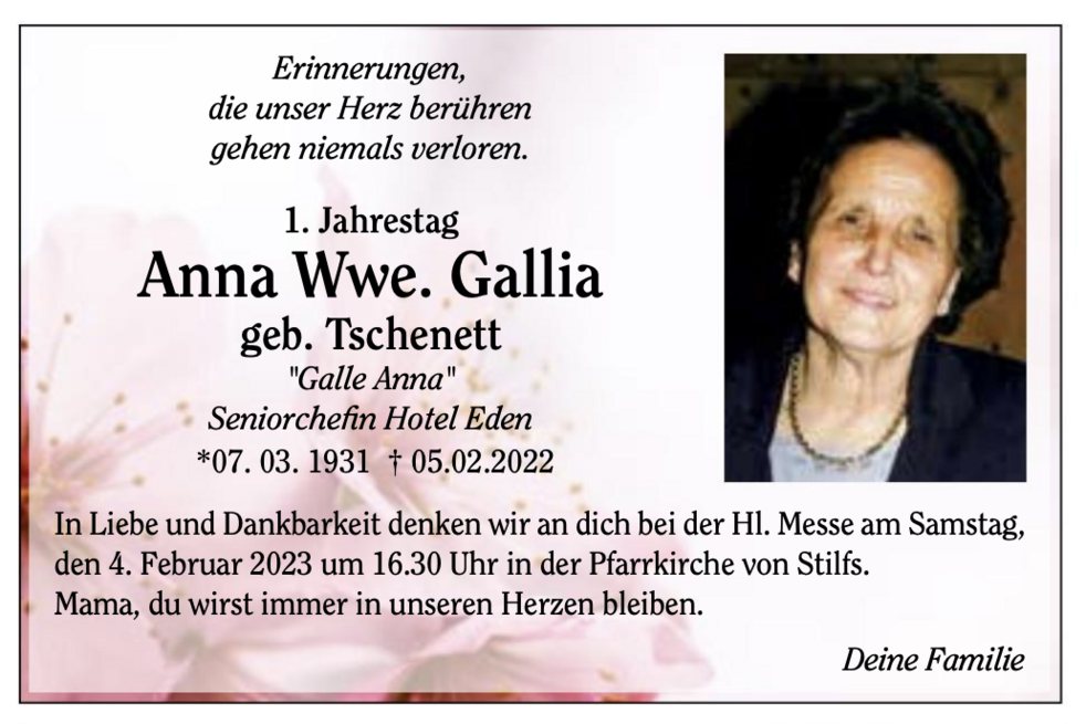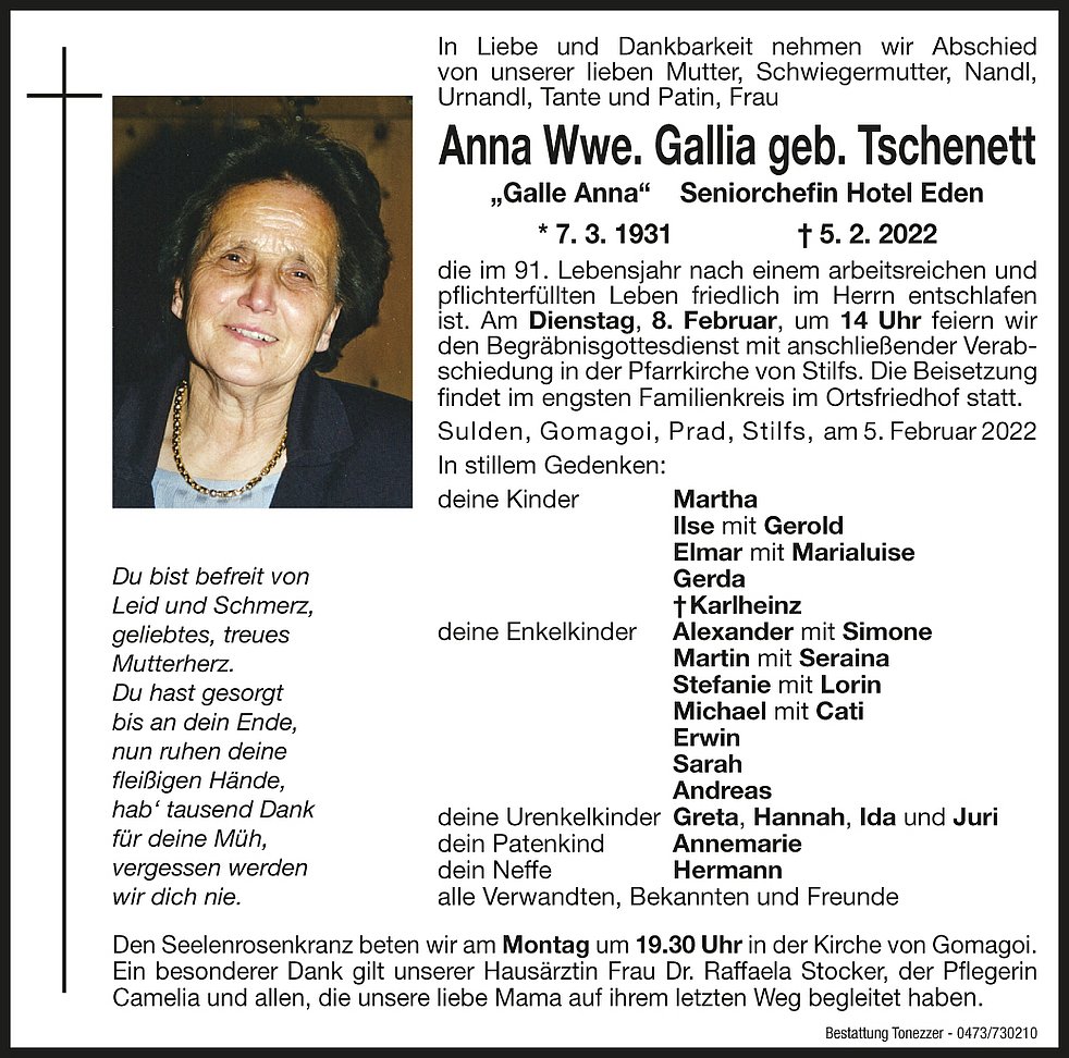 Am Dienstag, 8. Februar, um 14 Uhr feiern wir den Begräbnisgottesdienst mit anschließender Verabschiedung in der Pfarrkirche von Stilfs.
