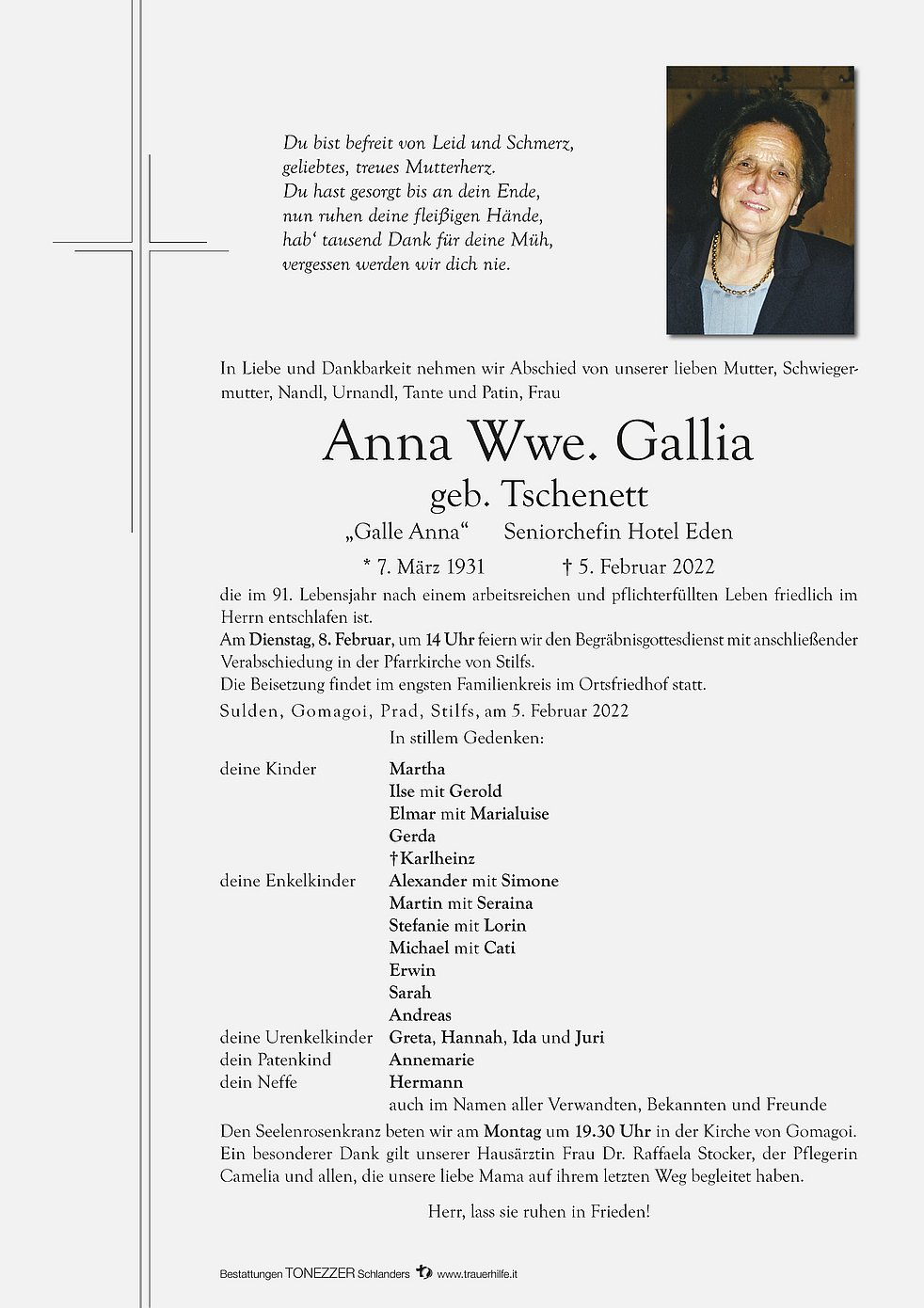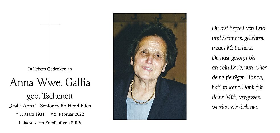 Ein besonderer Dank gilt unserer Hausärztin Frau Dr. Raffaela Stocker, der Pflegerin Camelia und allen, die unsere liebe Mama auf ihrem letzten Weg begleitet haben.