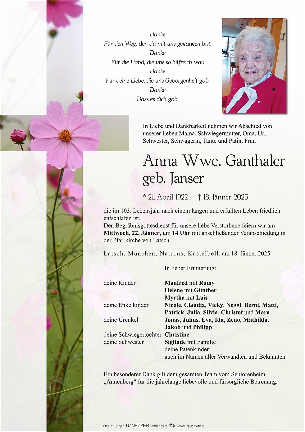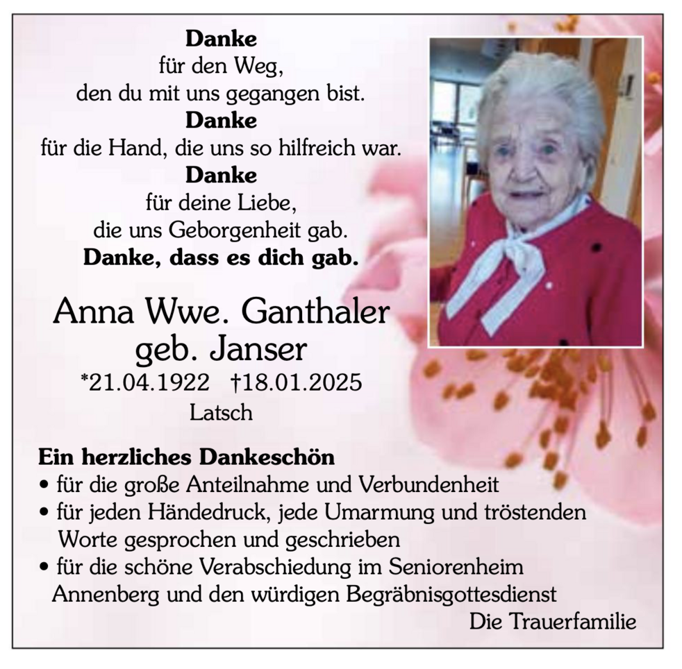 Wir drücken den Trauerfamilien unser herzliches Beild aus. Einschlafen dürfen, wenn man müde ist, und eine Last fallen lassen dürfen, die man lange getragen hat, das ist eine wunderbare Sache. Ruhe in Frieden Anna, unsere Dorfgemeinschaft nimmt Abschied von unserer Dorfältesten Mitbürgerinn und das ewige Licht der Erlösung möge dir leuchten.