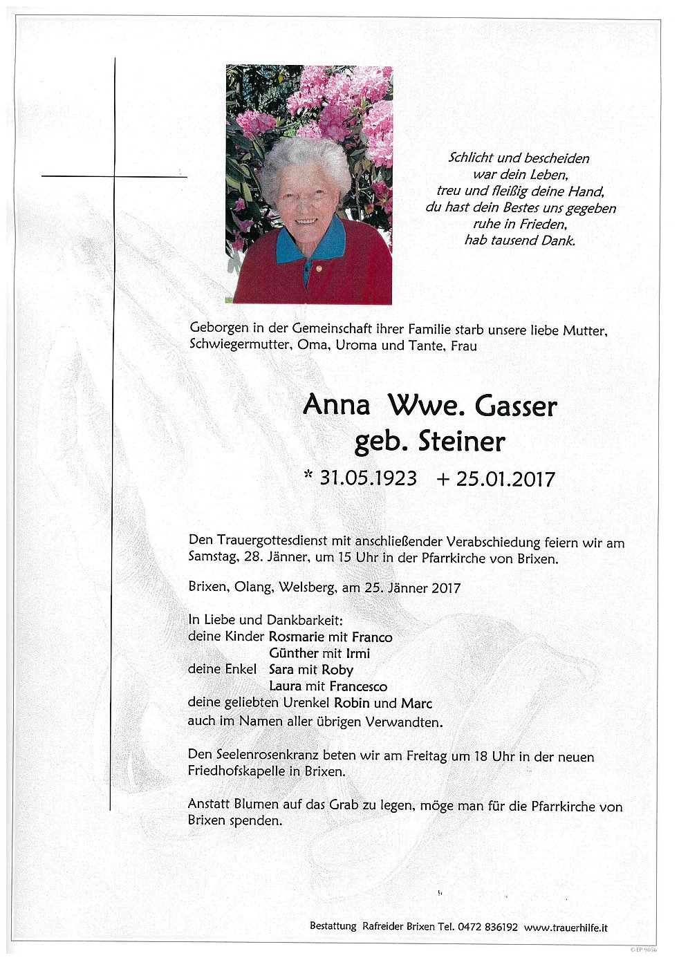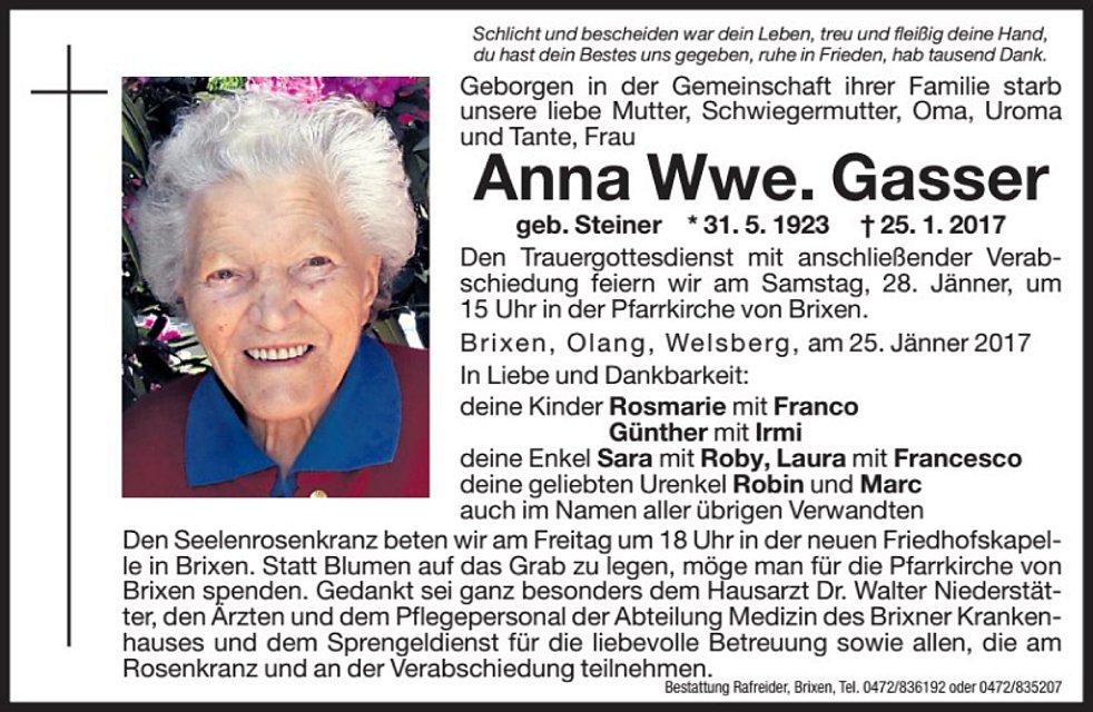 Gedankt sei ganz besonders dem Hausarzt Dr. Walter Niederstätter, den Ärzten und dem Pflegepersonal der Abteilung Medizin des Brixner Krankenhauses und dem Sprengeldienst für die liebevolle Betreuung sowie allen, die am Rosenkranz und an der Verabschiedung teilnehmen.