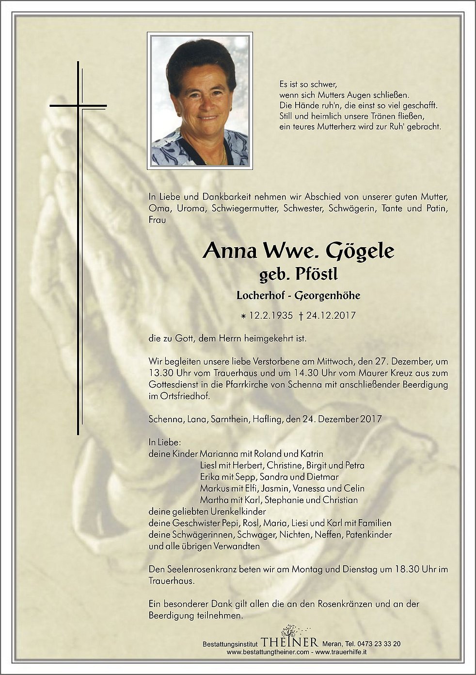 Wir begleiten unsere liebe Verstorbene am Mittwoch, den 27. Dezember, um 13.30 Uhr vom Trauerhaus und um 14.30 Uhr vom Maurer Kreuz aus zum Gottesdienst in die Pfarrkirche von Schenna mit anschließender Beerdigung im Ortsfriedhof.