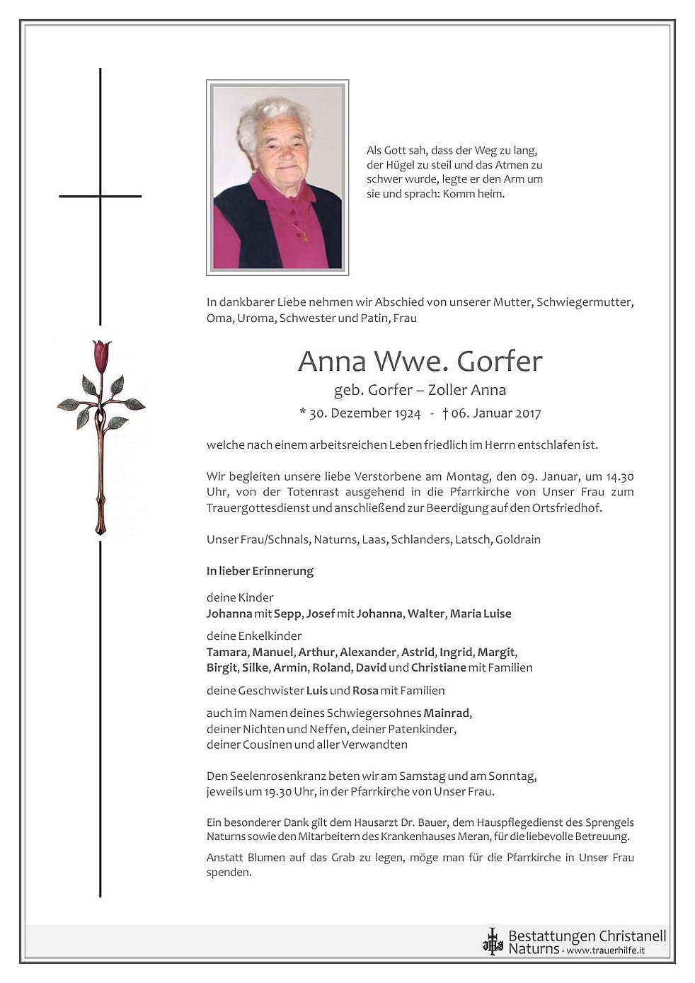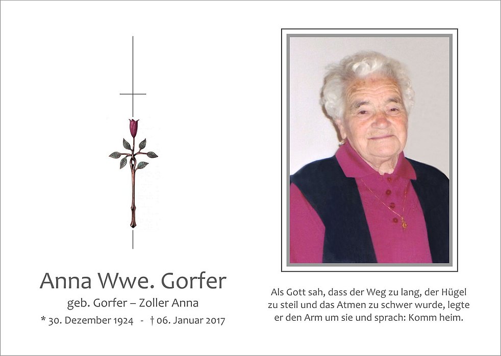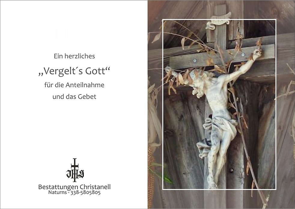 Ein besonderer Dank gilt dem Hausarzt Dr. Bauer, dem Hauspflegedienst des Sprengels Naturns sowie den Mitarbeitern des Krankenhauses Meran, für die liebevolle Betreuung.