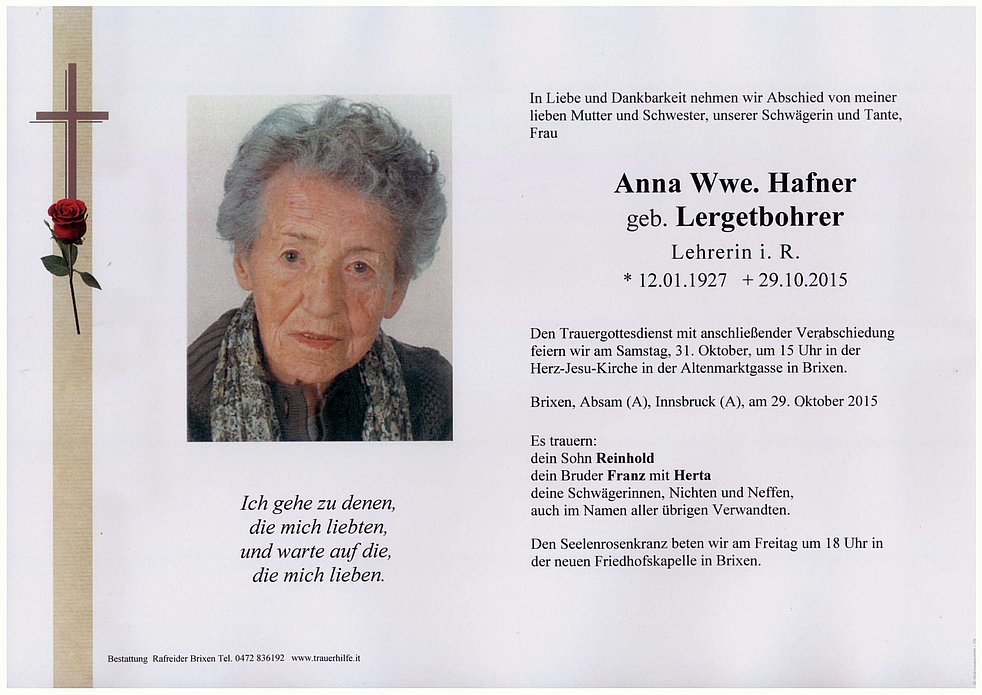 Gedankt sei dem Pflegepersonal des Bürgerheimes, 1. Wohnbereich, für die liebevolle Betreuung und allen, die am Rosenkranz und an der Verabschiedung teilnehmen.