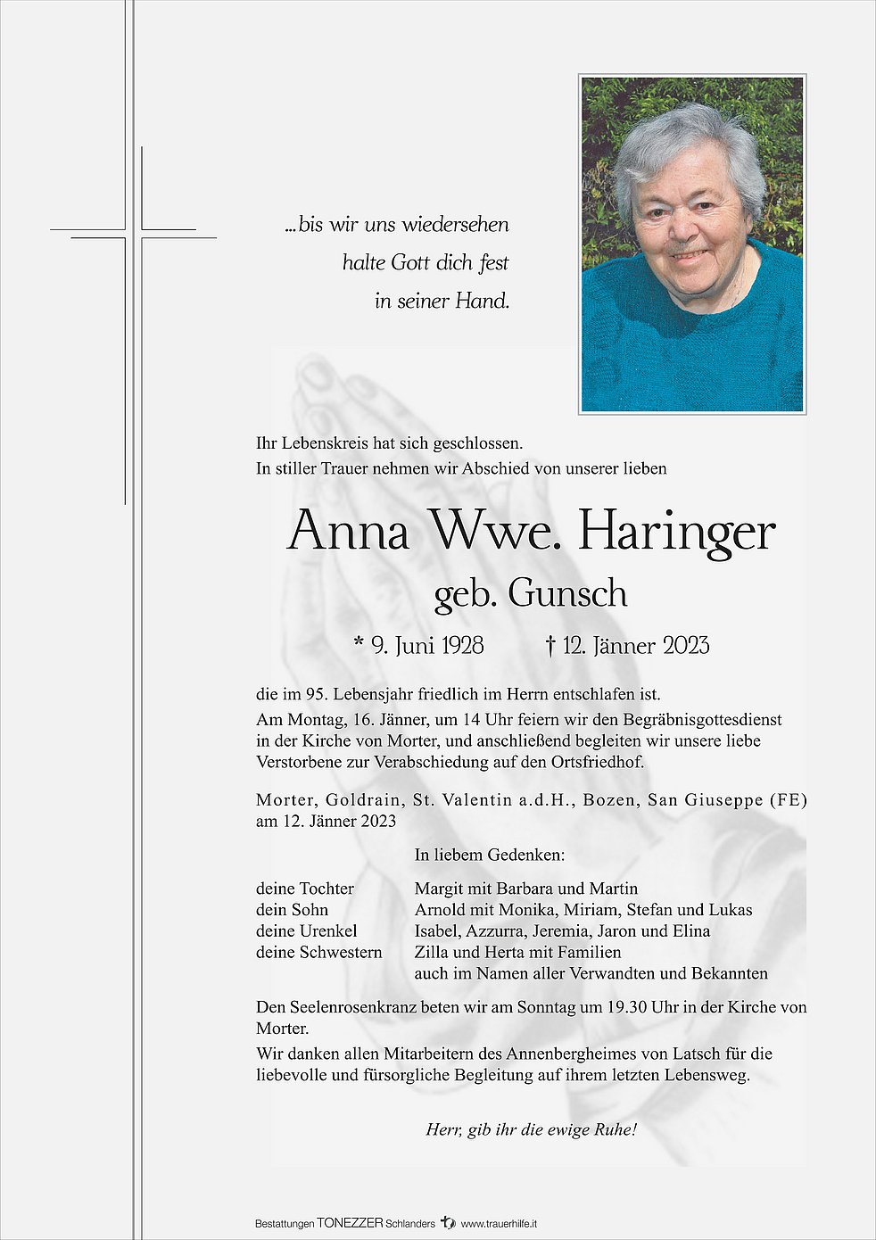 Am Montag, 16. Jänner, um 14 Uhr feiern wir den Begräbnisgottesdienst in der Kirche von Morter, und anschließend begleiten wir unsere liebe Verstorbene zur Verabschiedung auf den Ortsfriedhof.