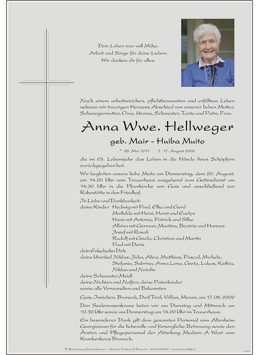 Wir begleiten unsere liebe Muito am Donnerstag, dem 20. August, um 14.20 Uhr vom Trauerhaus ausgehend zum Gottesdienst um 14.30 Uhr in die Pfarrkirche von Gais und anschließend zur Ruhestätte in den Friedhof.