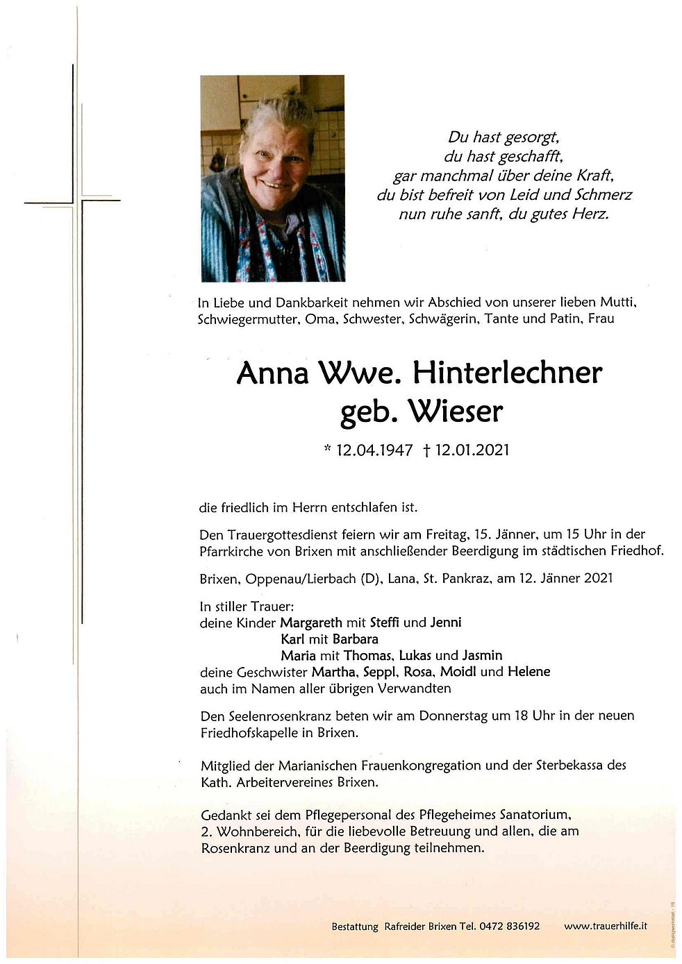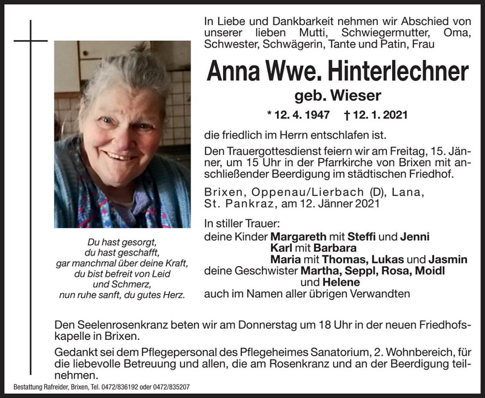 Den Trauergottesdienst feiern wir am Freitag, 15. Jänner, um 15 Uhr in der Pfarrkirche von Brixen mit anschließender Beerdigung im städtischen Friedhof.