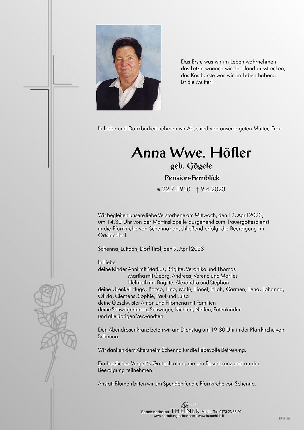 Wir begleiten unsere liebe Verstorbene am Mittwoch, den 12. April 2023, um 14.30 Uhr von der Martinskapelle ausgehend zum Trauergottesdienst in die Pfarrkirche von Schenna; anschließend erfolgt die Beerdigung im Ortsfriedhof.