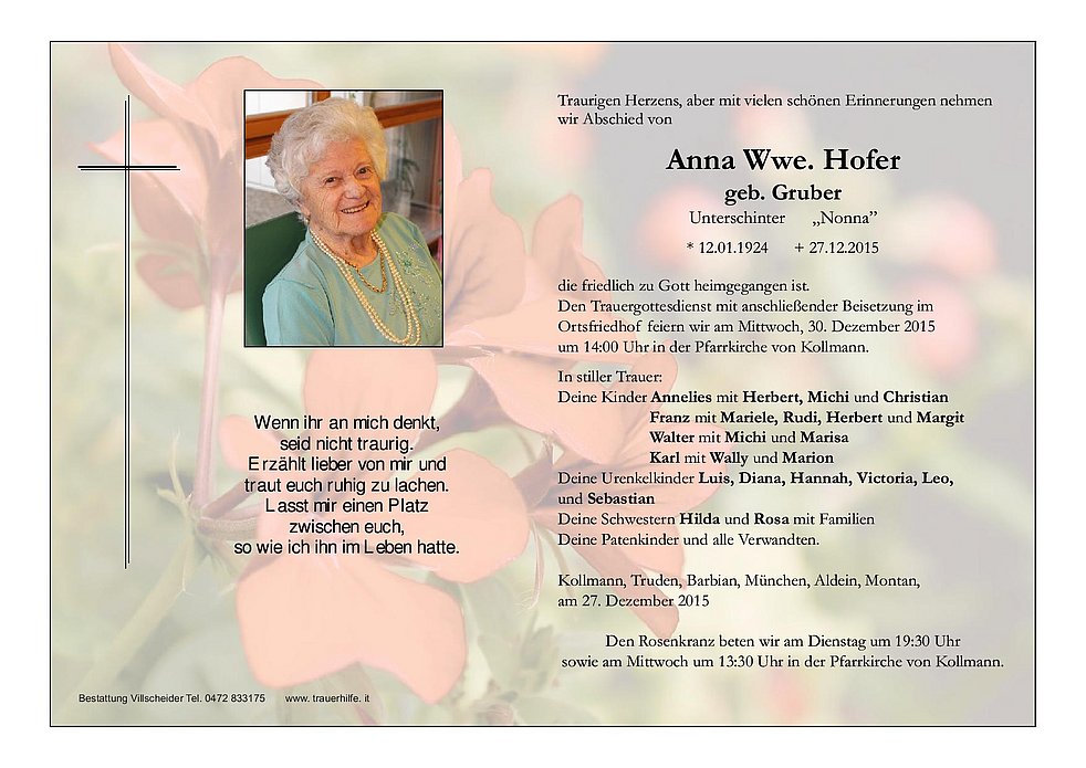 Den Trauergottesdienst mit anschließender Beisetzung im Ortsfriedhof feiern wir am Mittwoch, 30. Dezember 2015