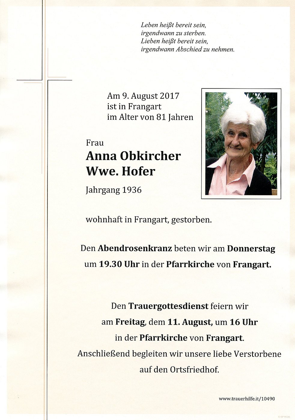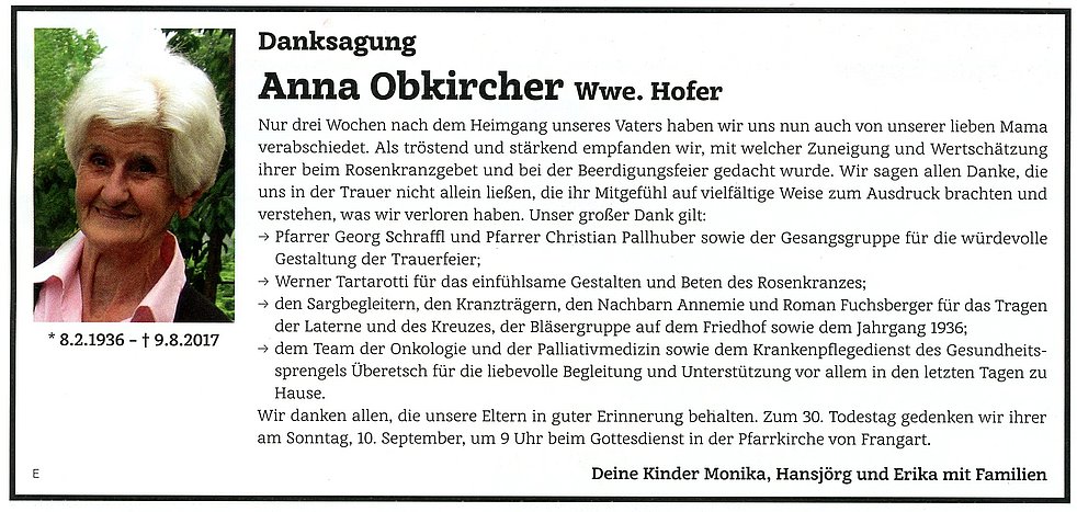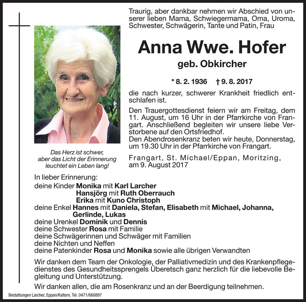 Den Trauergottesdienst feiern wir am Freitag, dem 11. August um 16 Uhr in der Pfarrkirche von Frangart. Anschließend begleiten wir unsere liebe Verstorbene auf den Ortsfriedhof.