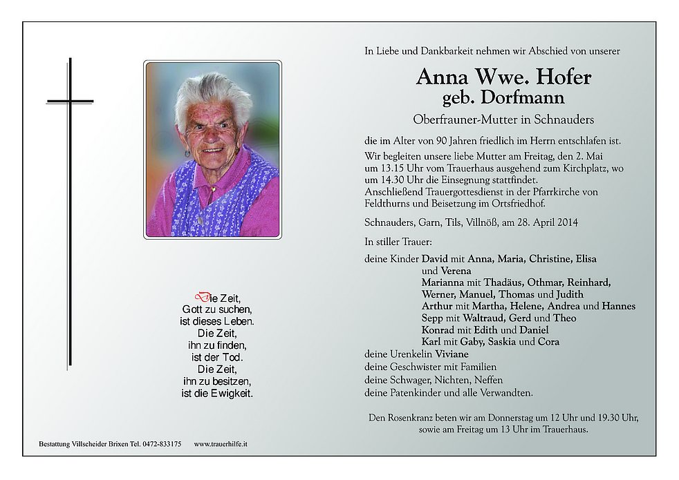 Anschließend Trauergottesdienst in der Pfarrkirche von Feldthurns und Beisetzung im Ortsfriedhof.